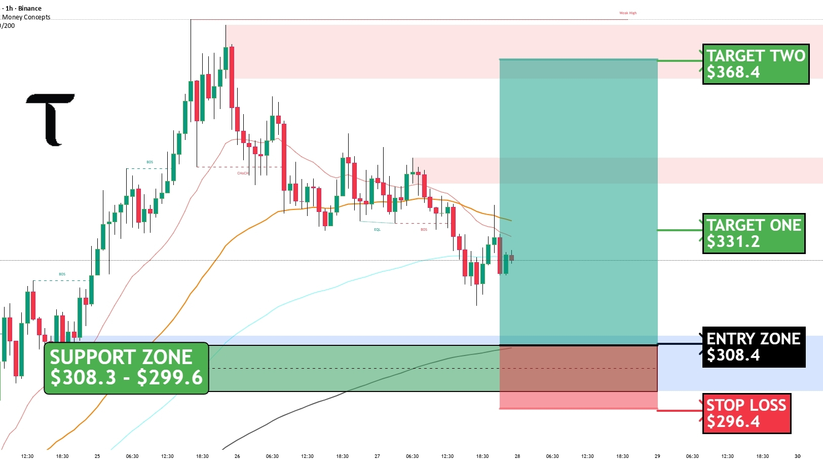 Price is sitting around $308 – $299, which lines up with previous demand + higher timeframe support. You can already see buyers trying to defend this area with those wicks forming.