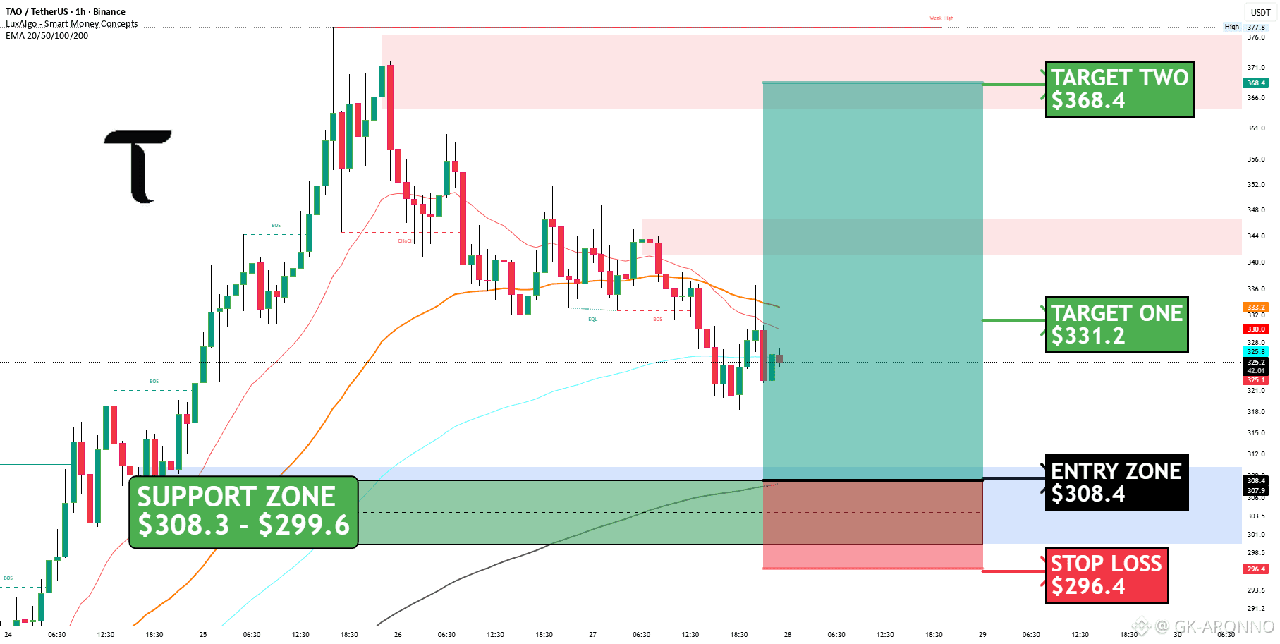 TAOUSDT on the 1H is coming down after a distribution phase and now tapping into a solid support zone.