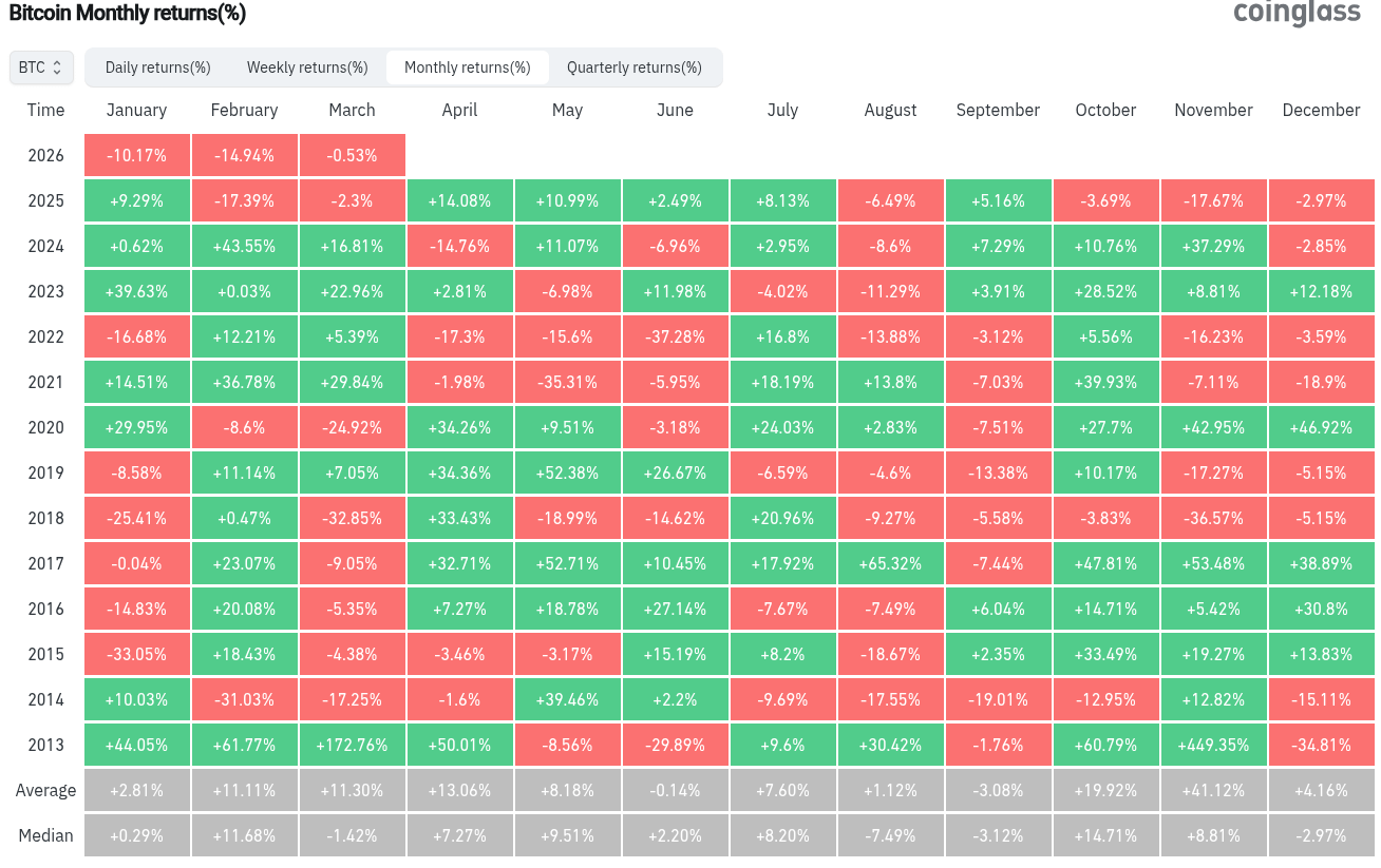 Retornos mensais do BTC/USD (captura de tela). Fonte: CoinGlass