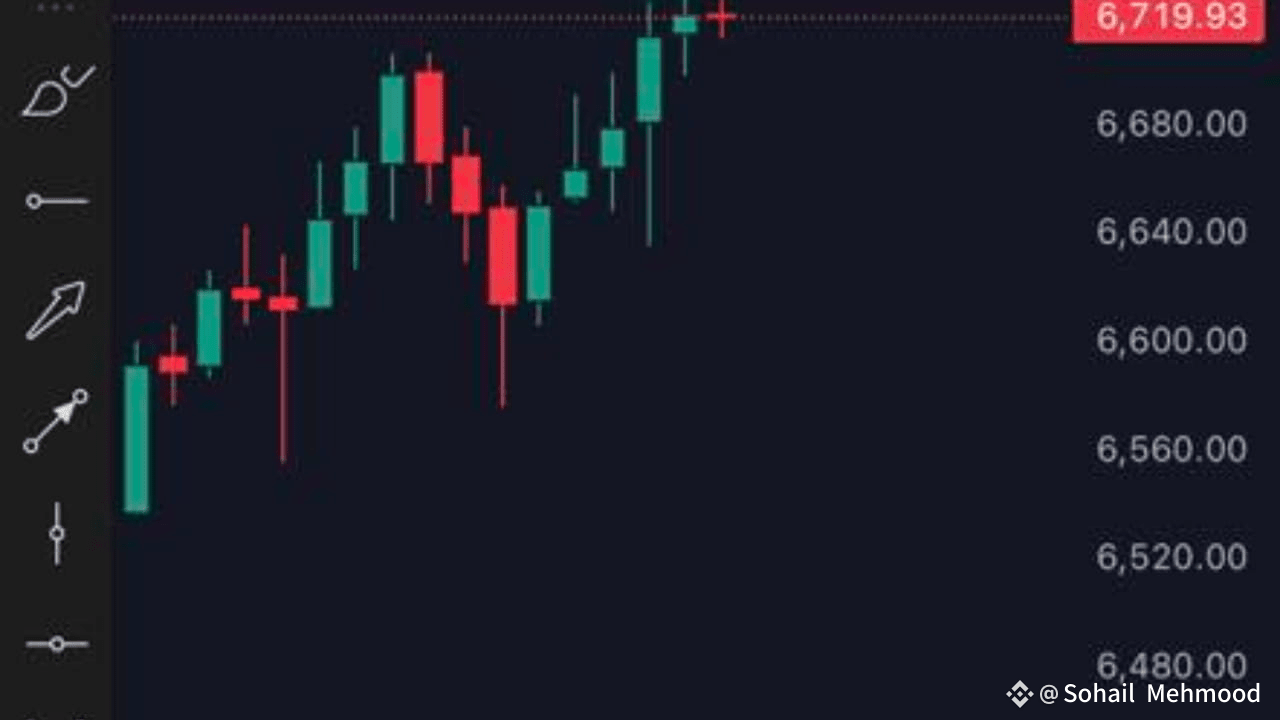 Fratello, la storia è che questa candela con la lunga ombra superiore è una coda di picco, il che significa che i compratori hanno spinto sopra 6750, ma i venditori l'hanno scaricata nuovamente e si è chiusa vicino a 6720