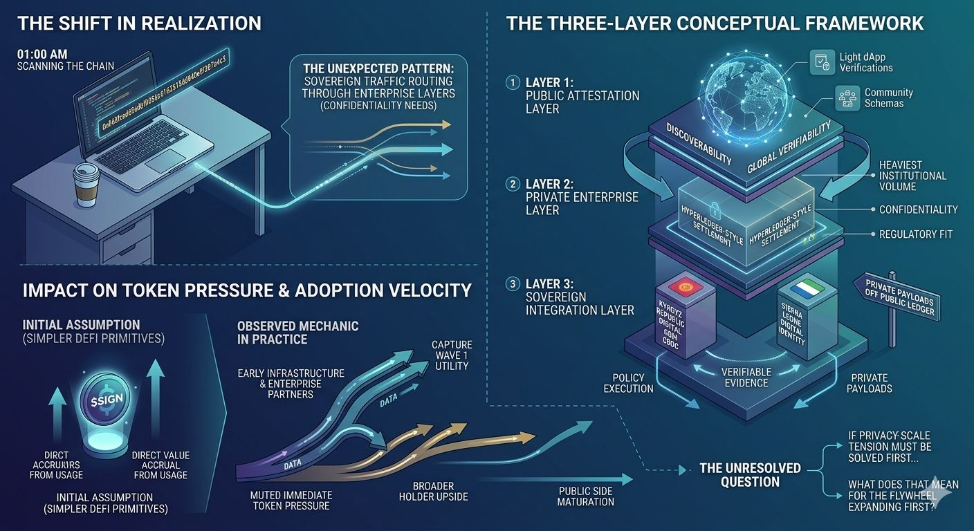 The first actionable insight hit early: Sign Protocol (@Sign #SignProtocol) doesn’t fight the privacy friction head-on like some attestation layers do. It builds a deliberate hybrid path that lets nations anchor integrity publicly while keeping the sensitive payloads off the main public ledger. The second insight followed right after — this approach buys real adoption speed but quietly throttles the immediate on-chain token pressure most holders are quietly banking on.