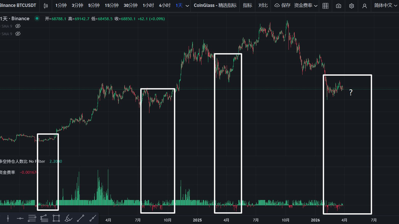 如图 3,当资金费率长期较低,且间歇性不断出现负溢价时,也同样说明做空力量加重,且逐步成为投机的“大多数”,在此阶段看多具有“少数派”优势。