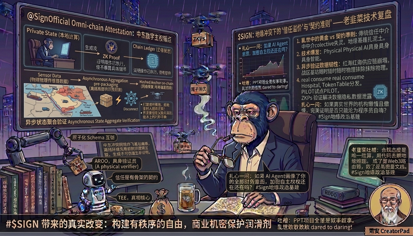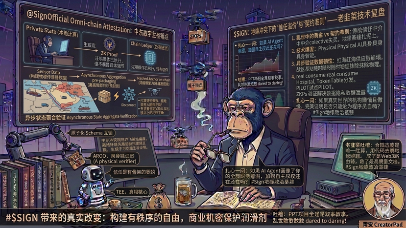 很多人看 Sign Protocol 只是把它当成一个链上的签名工具,这实在太肤浅了。我翻看他们的技术白皮书时,注意到一个之前被市场忽略的创新点,那就是“异步状态聚合验证”。大白话来说,就是在中东那种网络环境极差、基站动不动就被炸飞的战区,你不可能要求每一笔数据都实时在线同步。这种技术允许离线环境下产生的证据先通过局部共识进行“预封装”,等网络一恢复,立刻通过哈希锚定回链上。这种在极端环境下的数据韧性,才是真正的基建底色。