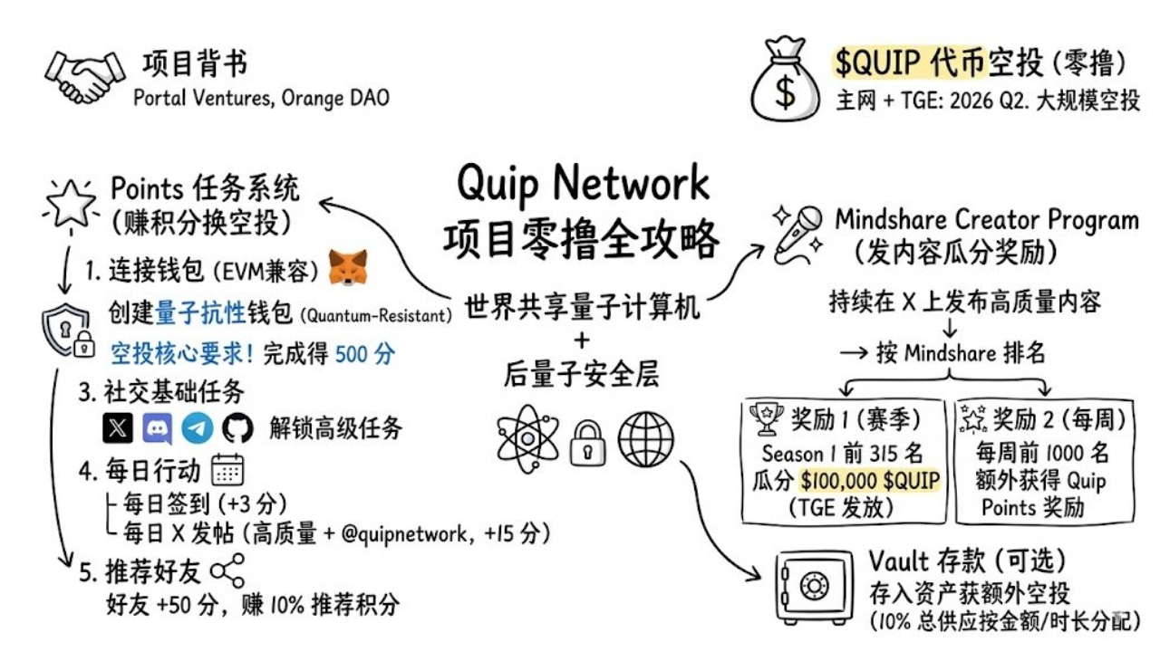 项目由 Portal Ventures 和 Orange DAO 背书,已确认将推出 $QUIP 代币,主网 + TGE 计划在 2026 Q2 进行,并伴随大规模空投。