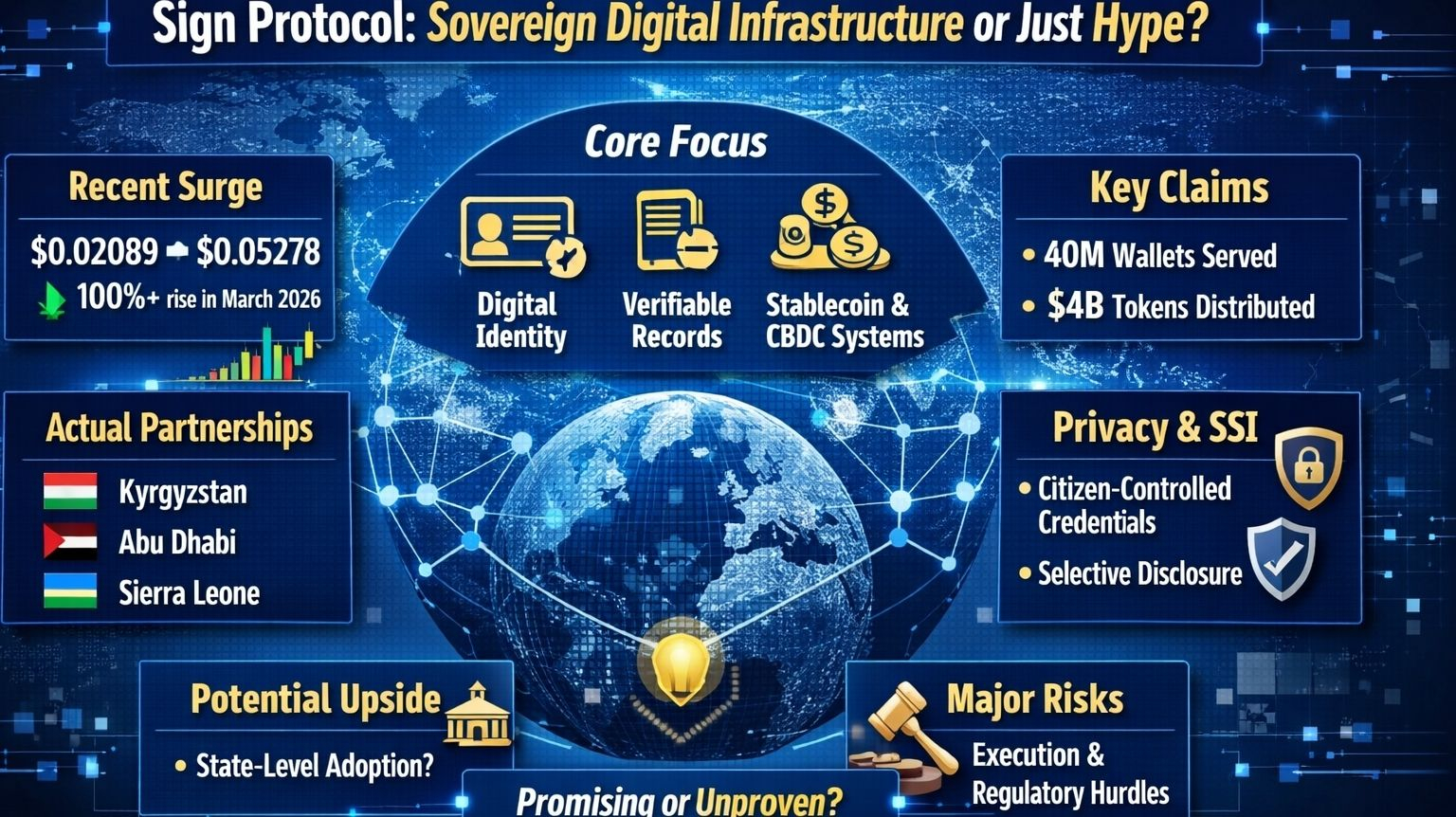 Alla fine, la storia è semplice. C'è sicuramente un hype attorno al Sign Protocol, ma ci sono anche segnali visibili di sostanza. I dati ufficiali mostrano che ha elaborato milioni di attestazioni e facilitato miliardi di dollari in distribuzioni di token a decine di milioni di wallet. Allo stesso tempo, i suoi materiali pubblici lo collegano a una visione più ampia che coinvolge identità digitale, registri sovrani, distribuzione di benefici pubblici e infrastrutture adiacenti a CBDC. Sarebbe troppo presto per definirlo completamente provato, ma sarebbe anche inaccurato scartarlo come una narrativa vuota. Il modo più equilibrato per comprendere Sign in questo momento è questo: una scommessa promettente sull'infrastruttura sovrana la cui reale credibilità sarà determinata da futuri traguardi di dispiegamento.