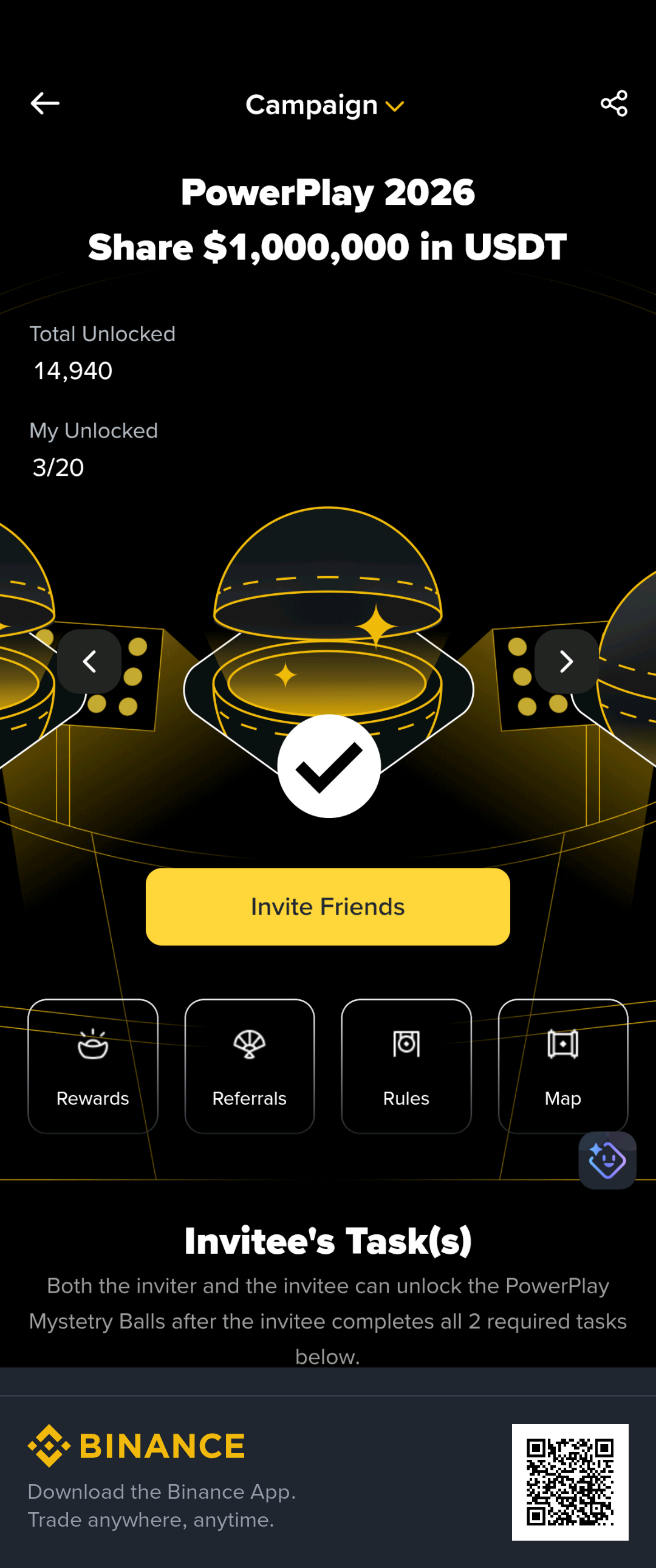 It’s a special campaign where both the inviter and the invitee can unlock PowerPlay Mystery Balls containing $USDT rewards.🧨
