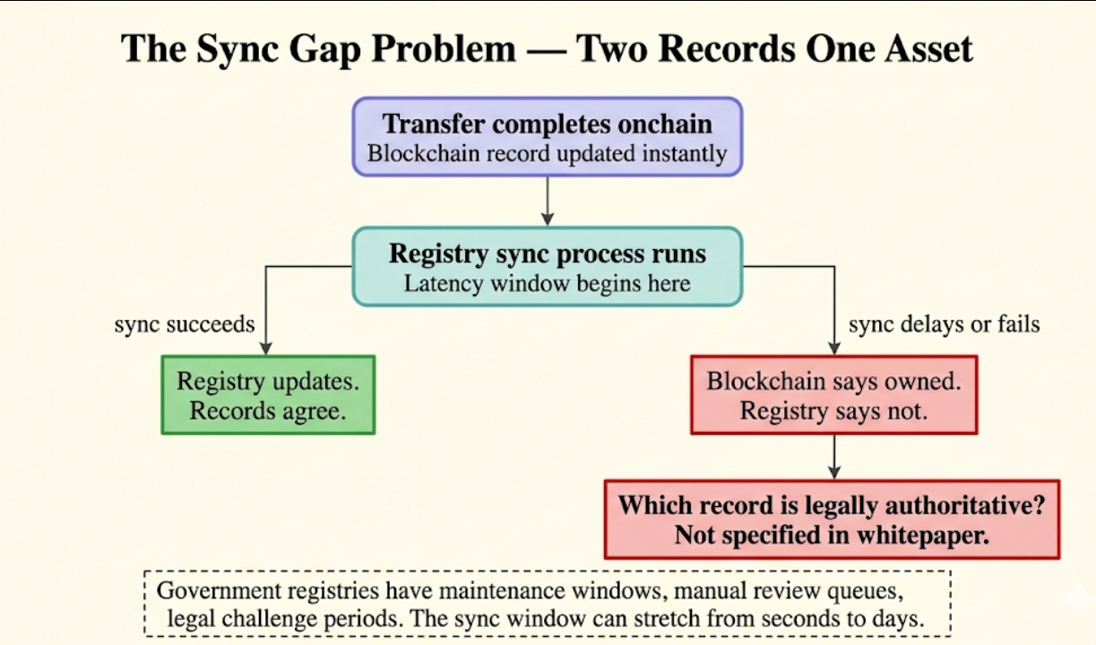 The onchain record and the government registry record are not the same thing. They are connected by a synchronisation process. And a synchronisation process has latency. And latency means there is always a window where the blockchain says one thing and the registry says something else.