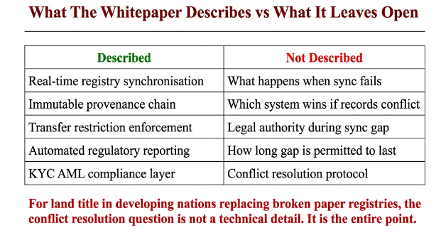 The whitepaper describes registry integration as real-time synchronisation and covers the technical architecture for that sync at a high level. What it does not describe anywhere is the conflict resolution protocol. What happens when sync fails. Which system is legally authoritative if they disagree. How long the legal gap window is permitted to stretch before a transfer is considered legally incomplete.