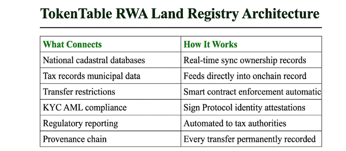 tokenTable connects directly to existing government land registries and property databases through direct integration, not replacement. Realtime synchronisation of property ownership records. Cadastral systems, tax records, and municipal property information all feeding into the onchain record simultaneously. When ownership transfers onchain the registry is supposed to reflect it. When the registry updates the onchain record is supposed to follow.