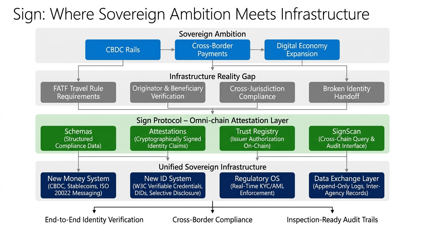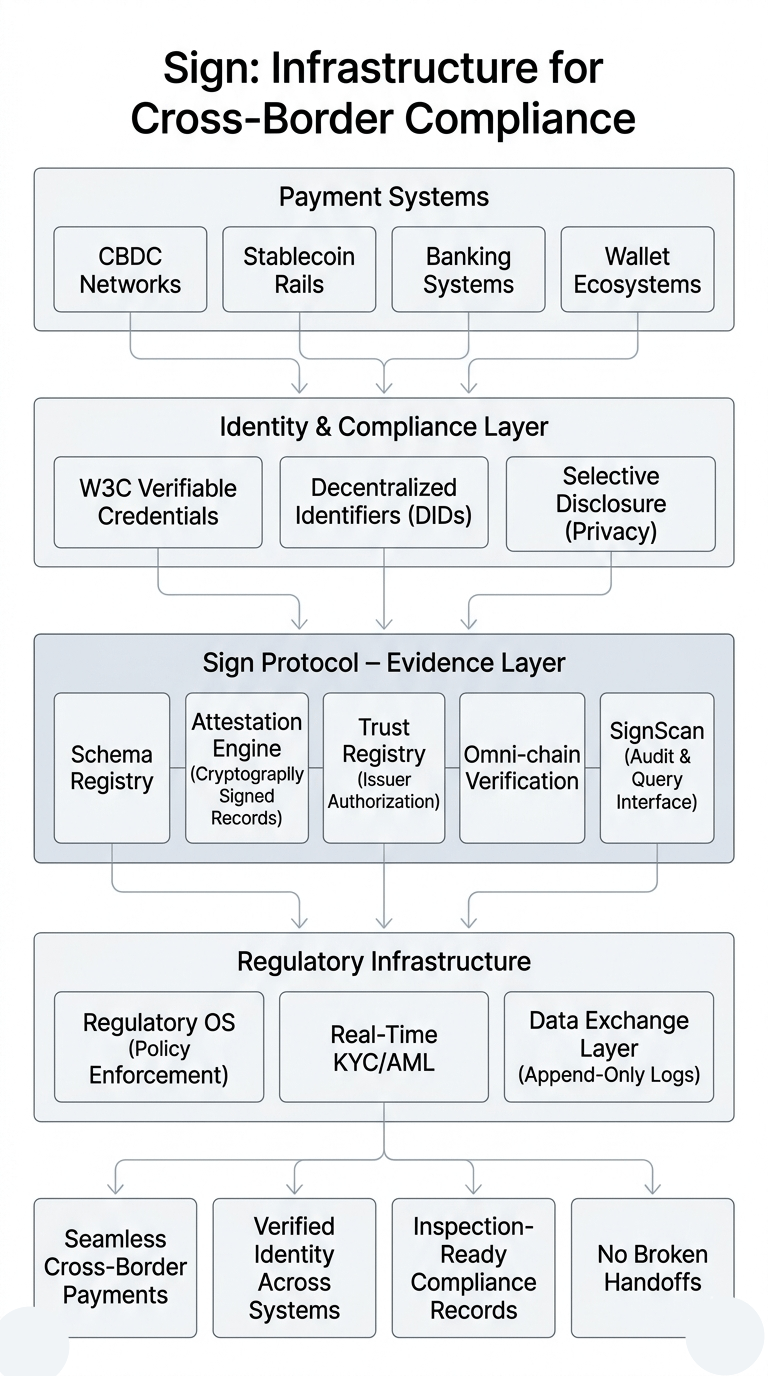 it needs a shared evidence layer where cryptographically signed claims about originator and beneficiary identity travel with the payment across every hop in the chain without degrading. it needs a trust registry where every government authority, every regulated operator, and every issuing institution is recorded on-chain so any verifier anywhere in the payment chain can confirm the claim without calling back to the source. it needs attestations structured through schemas, inspection-ready, and queryable through SignScan across chains and storage modes simultaneously — so the compliance record is as portable as the payment itself.