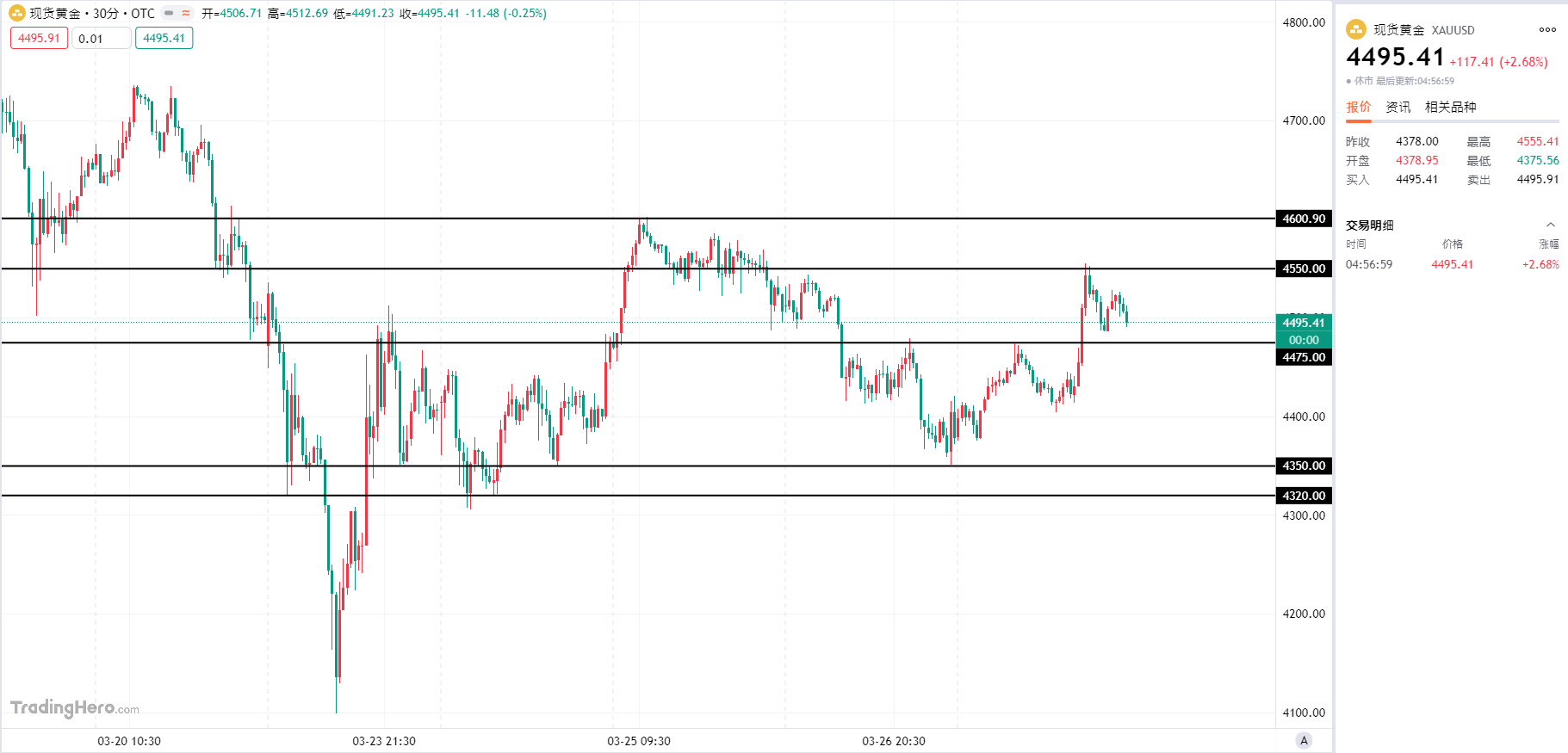 本周金价来回波动超300美元,先大跌后反弹,整体稳住了。周初金价继续跌,最低到4351,之后开始强势反弹,25号单日大涨3.18%,是近期涨得最猛的一天;但好景不长,26号又大跌超2%,把前一天的涨幅吐回去不少;最后两天金价慢慢稳住,靠着关键支撑位小幅反弹,最终周线收涨。主要是两股力量在拉扯:美联储态度强硬、降息推迟、美元走强,压着金价;但中东局势紧张,避险需求又托着金价。