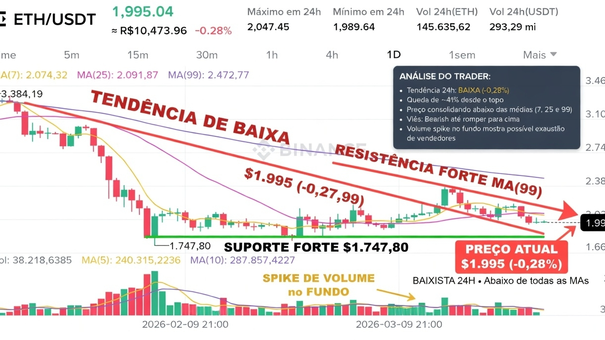 Il prezzo è crollato da 3.384 a 1.995 (crollo brutale di ~41% dal massimo), e nelle ultime 24 ore ha perso -0,28% mentre continua a rimanere fermamente al di sotto di TUTTE le medie mobili (MA7 a 2.074, MA25 a 2.091 e MA99 a 2.472).