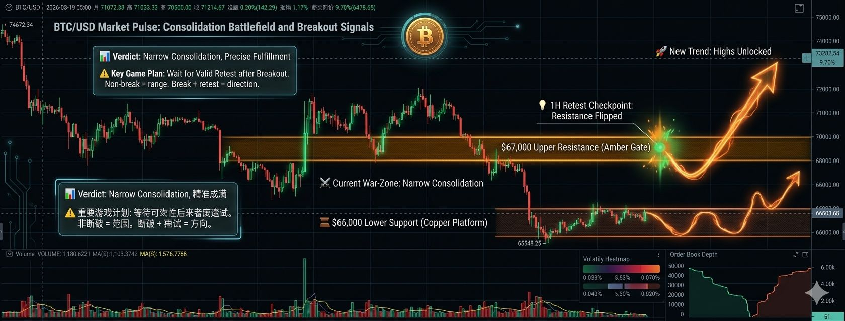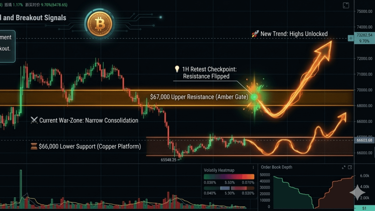 当前 $BTC 报价 $66,770,已在 $66,000 ~ $67,000 这个窄幅区间内横盘整整两天。