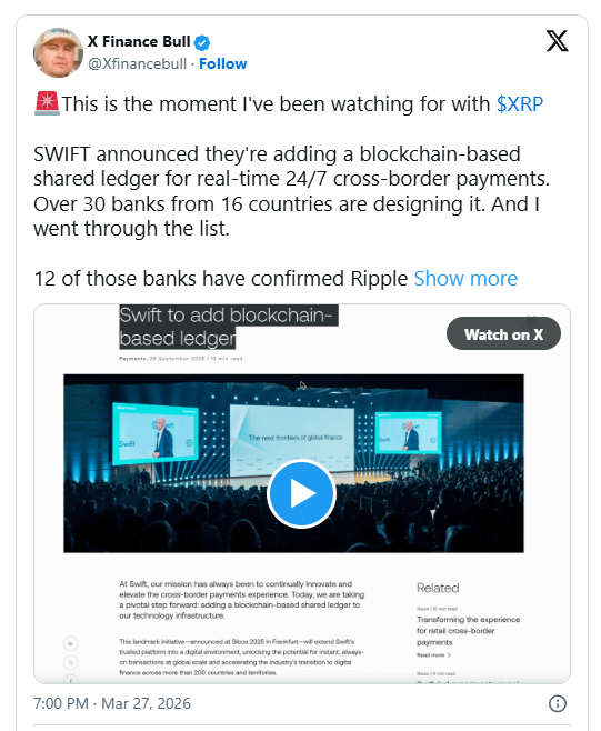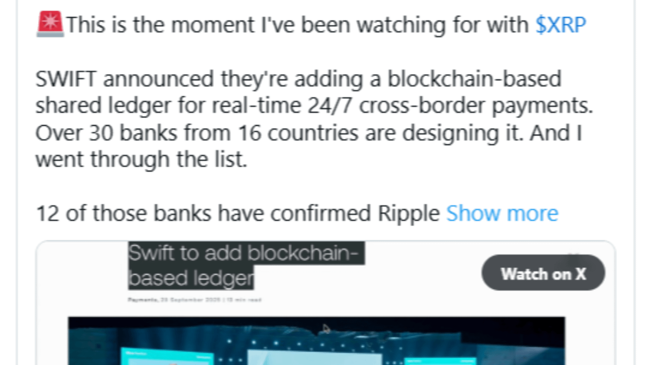 Questa osservazione forma l'argomento centrale del post, suggerendo un'intersezione significativa tra le ambizioni blockchain di SWIFT e la rete istituzionale esistente di Ripple.