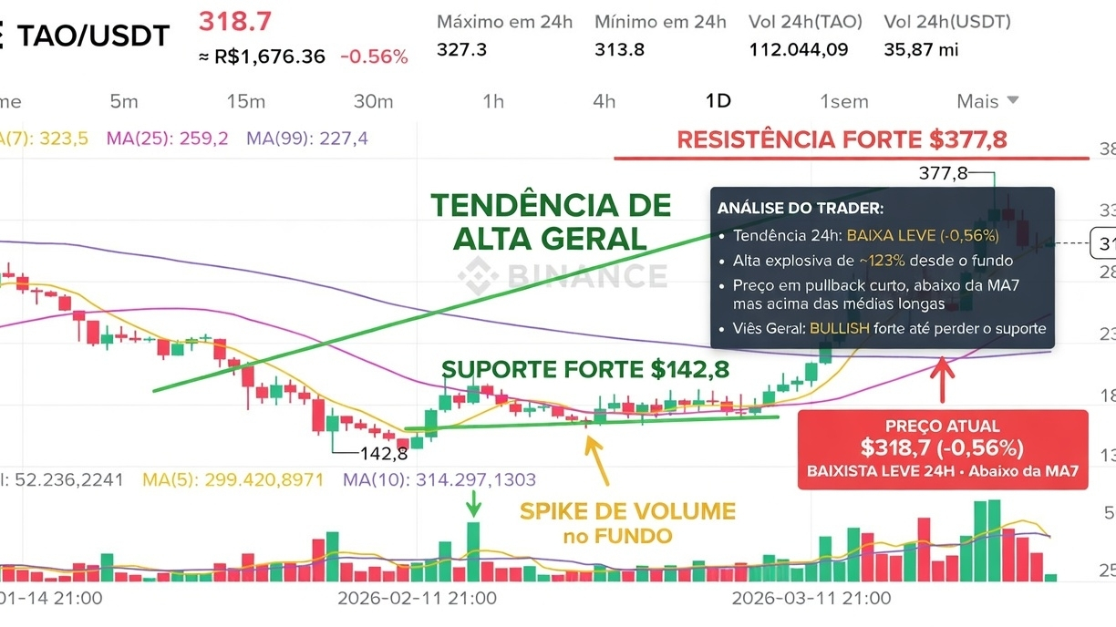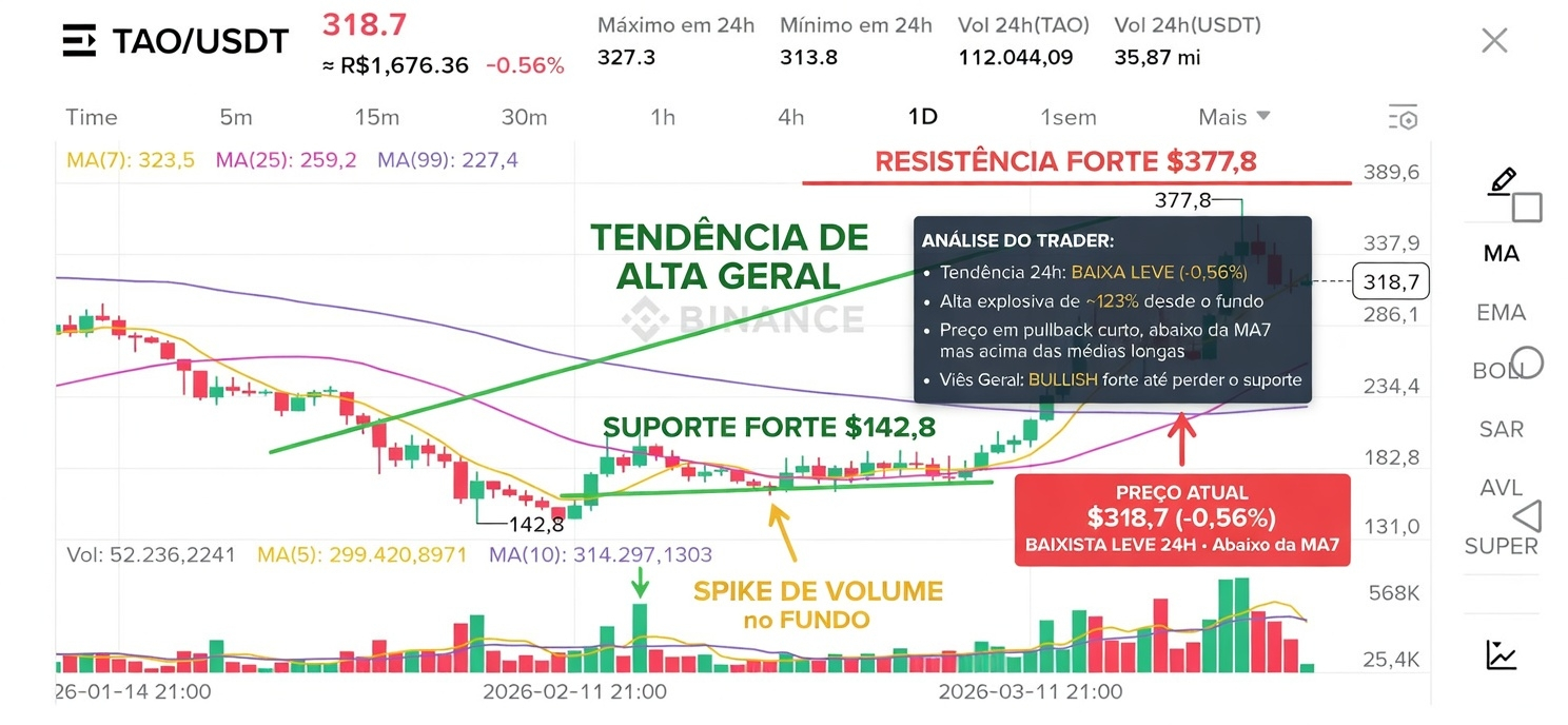 Olha o gráfico diário do TAO/USDT com todos os detalhes que você precisa ver:
