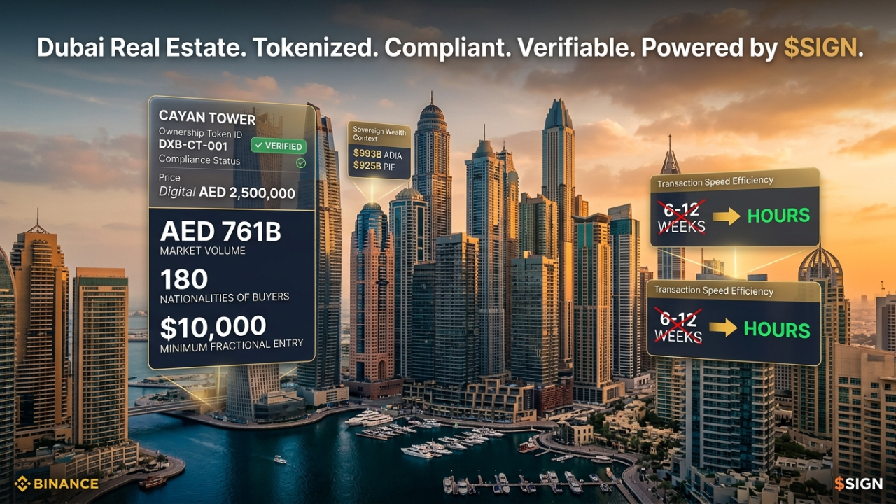 con l'immobiliare tokenizzato sull'infrastruttura di Sign, questo cambia completamente. vuoi acquistare il 10% di un appartamento a Dubai Marina? fatto. la tua proprietà frazionaria è certificata crittograficamente. ogni trasferimento passa attraverso lo stesso controllo di conformità automatizzato. il tuo diritto a un reddito da affitto è registrato come un artefatto di prova del Sign Protocol che puoi verificare tu stesso in qualsiasi momento.