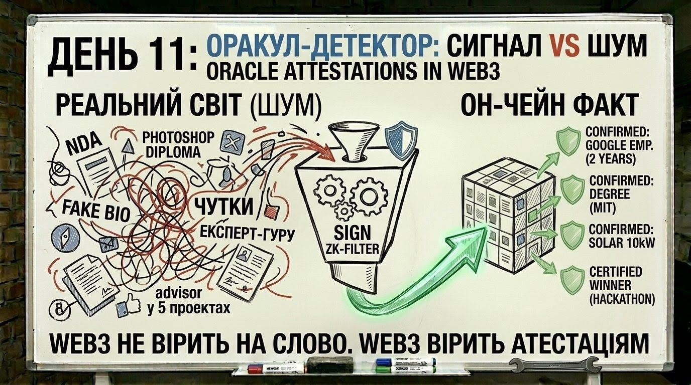І от тут стає трохи тупо: блокчейн — машина довіри, але вона ніби закрита в герметичній банці. Все, що «зовні» — твій досвід, дипломи, активи — для ончейну не існує. Або існує у вигляді кривих фото, які малюються в фотошопі за 5 хвилин.