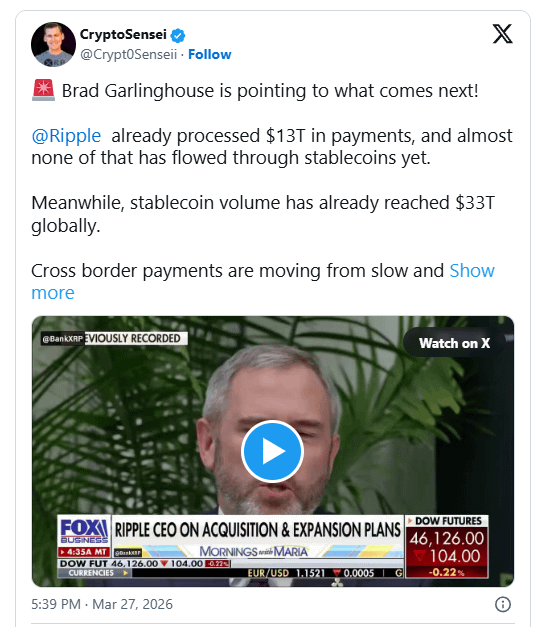 Il guru delle criptovalute CryptoSensei (@Crypt0Senseii) ha notato che Ripple ha già elaborato $13 trillion in pagamenti. Tuttavia, quasi nessuno di quel volume è passato attraverso stablecoin, anche se il volume globale delle stablecoin ha raggiunto $33 trillion.