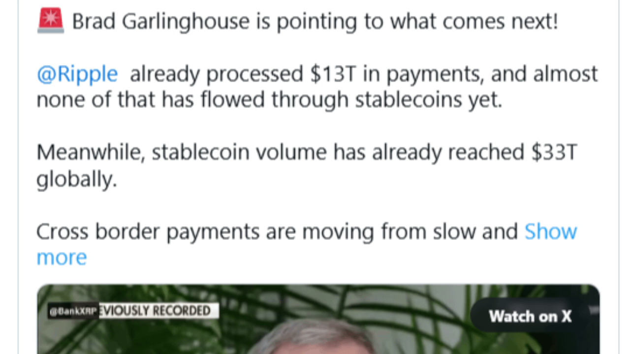 Garlinghouse ha anche rivelato la scala su cui Ripple opera già. Ha detto che Ripple Treasury, che era precedentemente GTreasury, ha orchestrato $13 trillion in pagamenti lo scorso anno, e "0% di quelli erano tramite una stablecoin o crypto." Questo è importante perché mostra che il sistema esistente gestisce già un volume enorme.