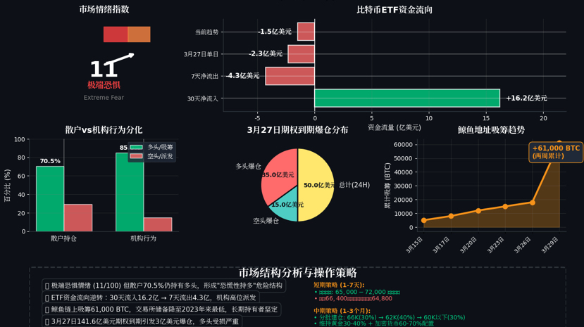 3月29日的市场处于典型的"黎明前的黑暗":极端恐惧情绪弥漫,散户在亏损中被迫持多,而机构在静默中吸筹。技术形态偏空但超卖严重,地缘风险缓解但宏观压力犹存。这种矛盾状态注定波动率将维持高位,但也为理性投资者提供了难得的风险收益不对称机会。