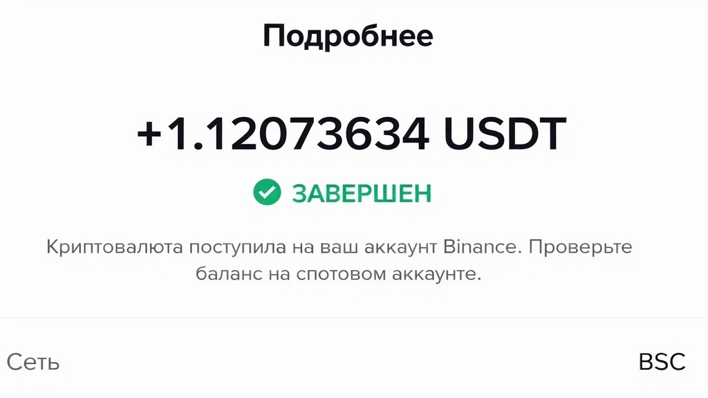 Nello screenshot si vede l'accredito di +1.12073634 USDT e lo stato "completato" ✅ — i fondi sono stati accreditati con successo sul conto Binance.