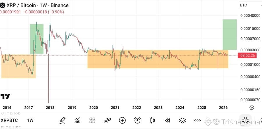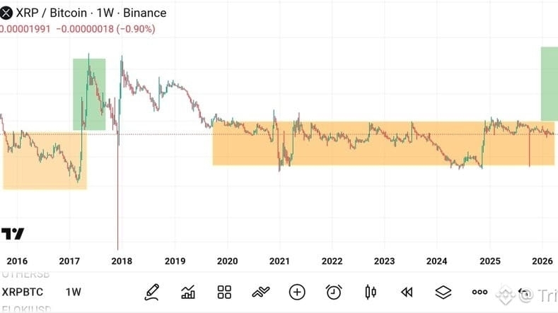 Il grafico della coppia XRP contro Bitcoin rivela un enorme modello di accumulo noto tecnicamente come (Multi-Year Accumulation). Il prezzo ora sta attraversando una fase molto simile a quella che si è verificata prima dell'esplosione leggendaria del 2017, mettendo la valuta sotto il mirino dei grandi investitori.