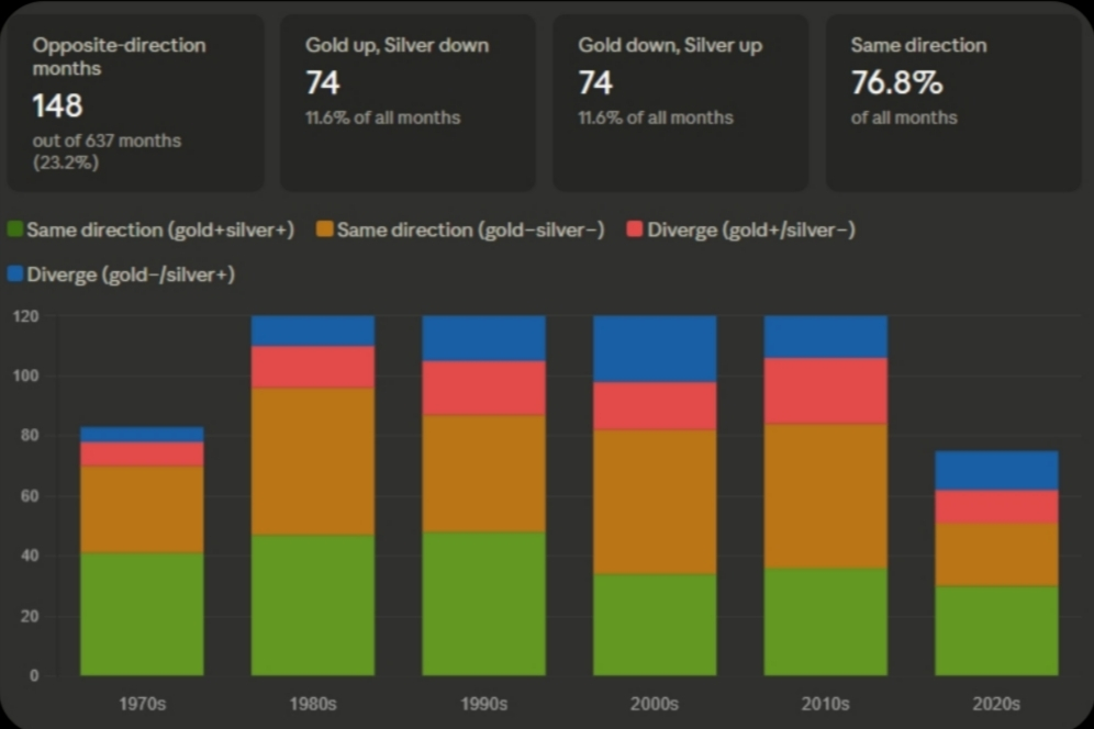 في 23% من الأشهر يعني تقريباً شهر من كل أربعة نري أن الذهب والفضة يتحركان في اتجاهات معاكسة تماماً. ترتفع الفضة والذهب يهبط، أو العكس.