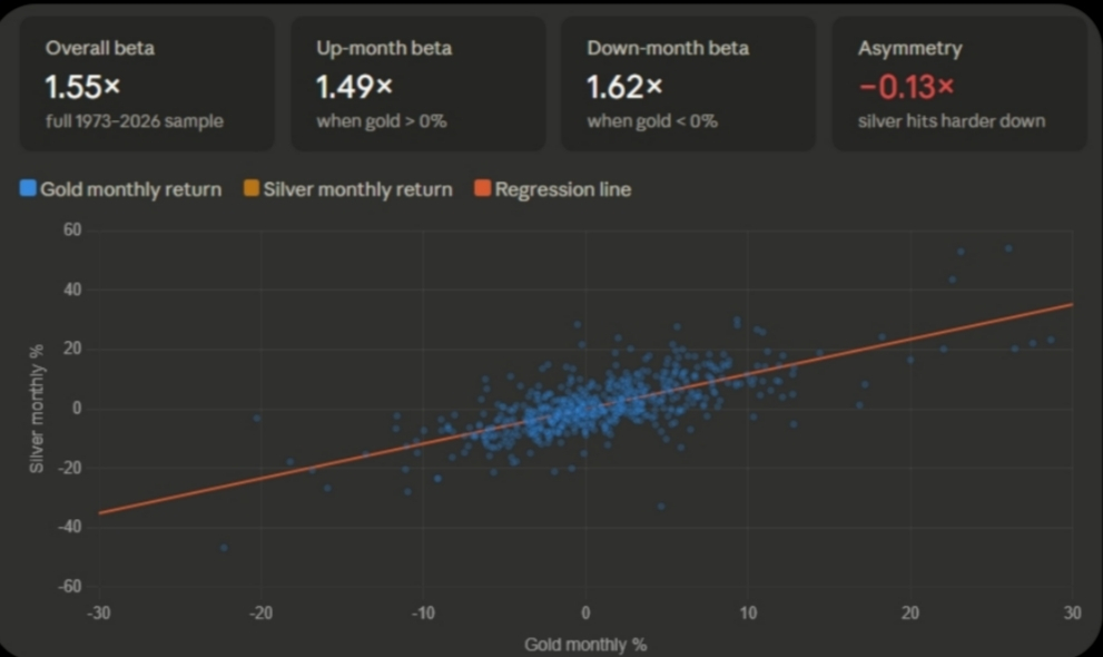 لكن ليس بنفس المقدار أبداً. المتوسط التاريخي يقول أن الفضة تتحرك بـ 1.5 ضعف حركة الذهب. بمعنى بسيط: