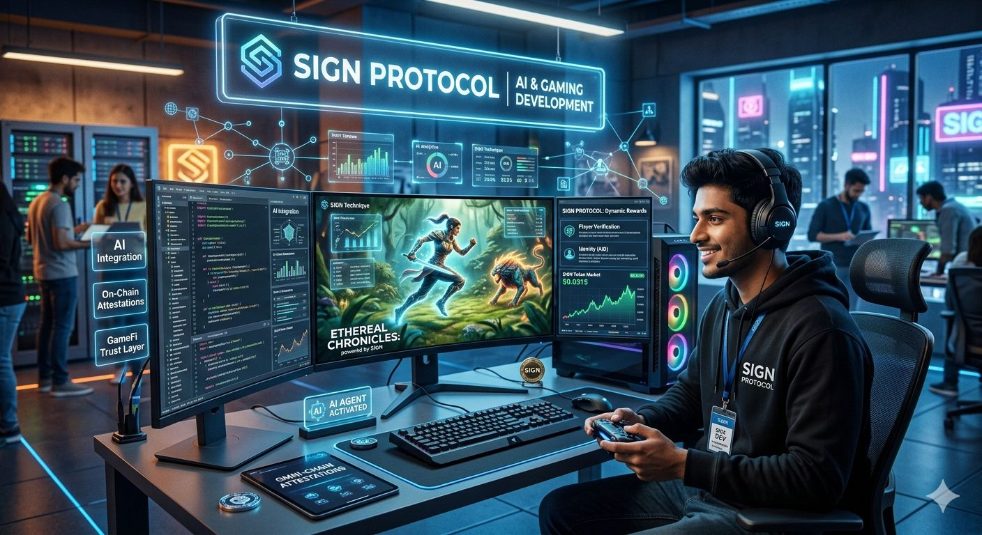 SIGN Protocol sirf ek token nahi magar Web3 gaming aur AI ka ek mazboot Trust Layer hoti hai. Game development mein iska sab se bada istemal Omni chain Attestations ke zariye hota hai. Iska matlab ye hai ke agar aap kisi game mein koi nayi talwar jeet-te hain ya koi level paar karten hain to SIGN technique us achievement ko ek digital certificate (attestation) mein badal deti hai jo har blockchain par verify ho sakti hai NFT.
