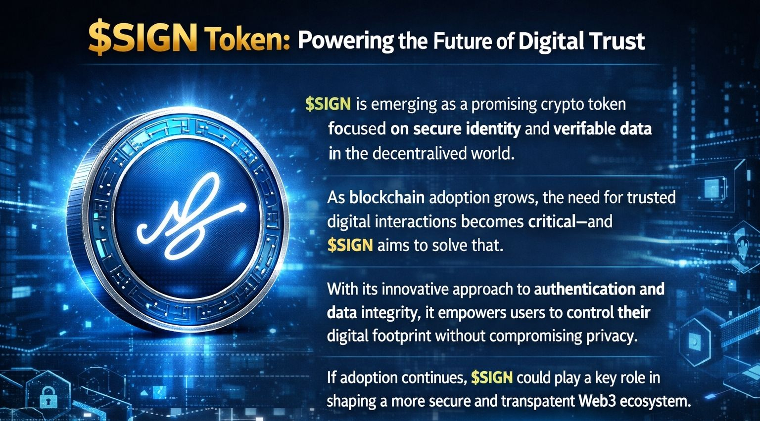 $SIGN is emerging as a promising crypto token focused on secure identity and verifiable data in the decentralized world. As blockchain adoption grows, the need for trusted digital interactions becomes critical and $SIGN aims to solve that. With its innovative approach to authentication and data integrity, it empowers users to control their digital footprint without compromising privacy. If adoption continues, $SIGN could play a key role in shaping a more secure and transparent Web3 ecosystem.