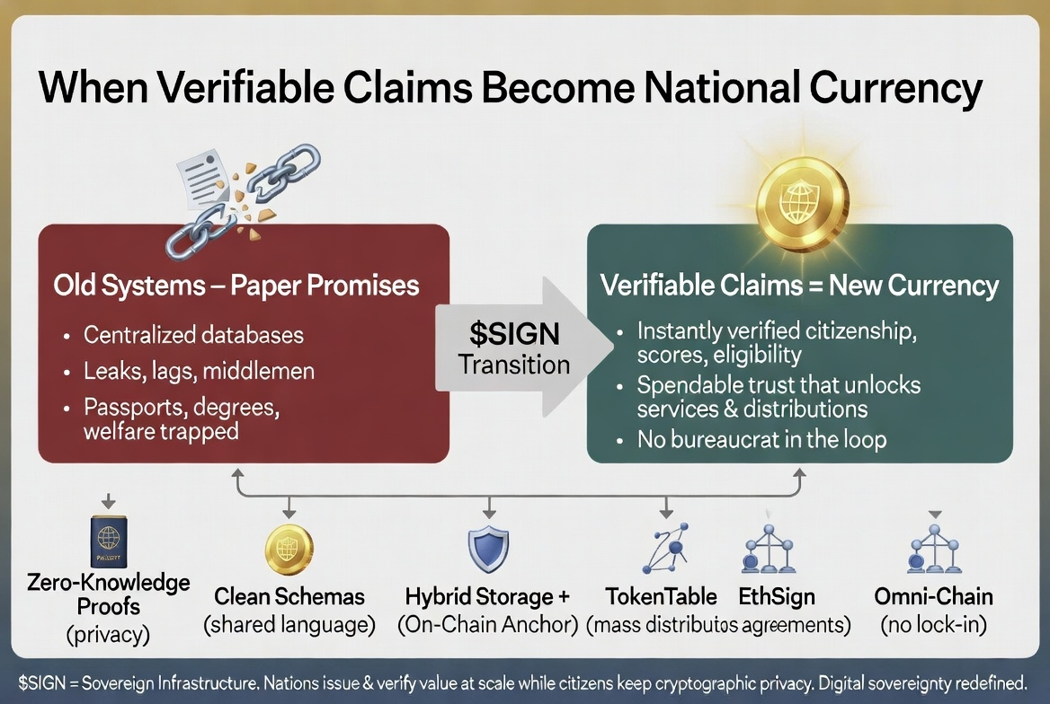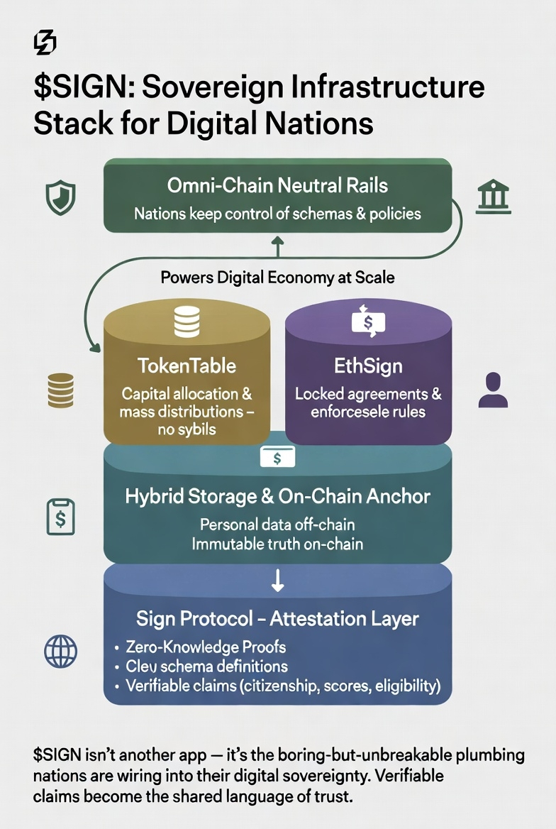 $SIGN is engineered exactly for that transition. it isn’t positioning itself as another consumer app layer or flashy DeFi gadget. it’s built as sovereign infrastructure: zero-knowledge proofs so a citizen can prove eligibility without exposing their full history, clean schema definitions so every ministry and every partner reads the same claim the same way, and hybrid storage that keeps the heavy personal data off-chain while anchoring the immutable truth on-chain. TokenTable turns those verified claims into mass distributions that actually reach millions without collapsing under sybils or manual review. EthSign locks the agreements themselves so the rules of the digital nation can’t be rewritten overnight. the whole stack travels omni-chain so a small nation doesn’t get locked into one blockchain’s politics or fees.