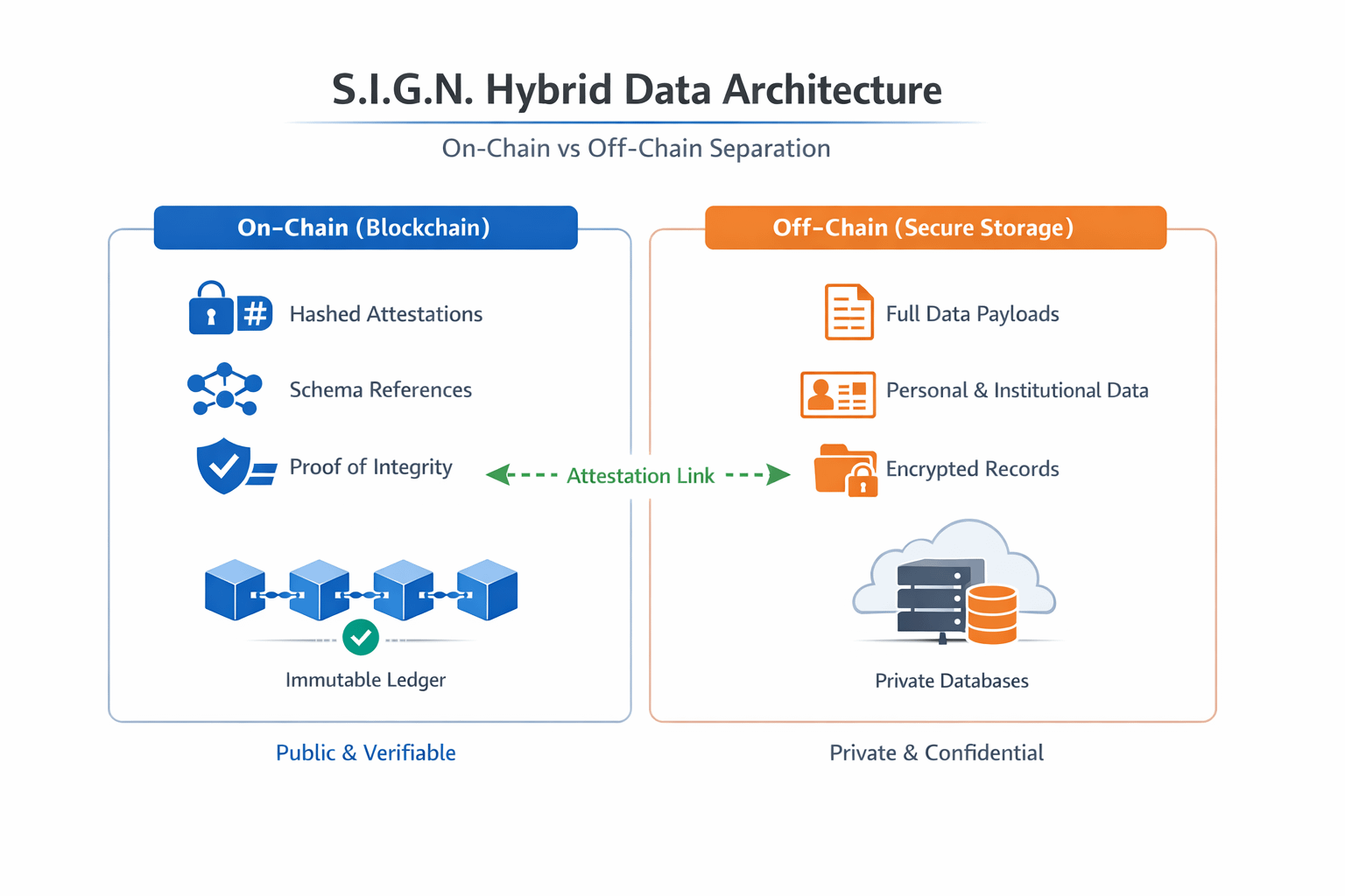 On chain, the system maintains cryptographic hashes of attestations, schema references, and proof of issuance and integrity. This creates a verifiable anchor without exposing raw data.