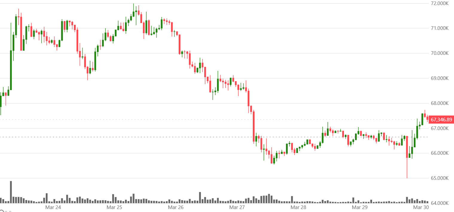 在刚刚过去的周末,中东紧张进一步升级,包括胡塞武装介入、美国增派部队以及伊朗袭击铝生产设施,冲击全球市场,并推动布伦特原油升至每桶约115美元。受此影响,比特币一度跌至2月战争相关暴跌以来的最低水平,随后在周一(3月30日)亚洲市场开盘后反弹至67,000美元上方。