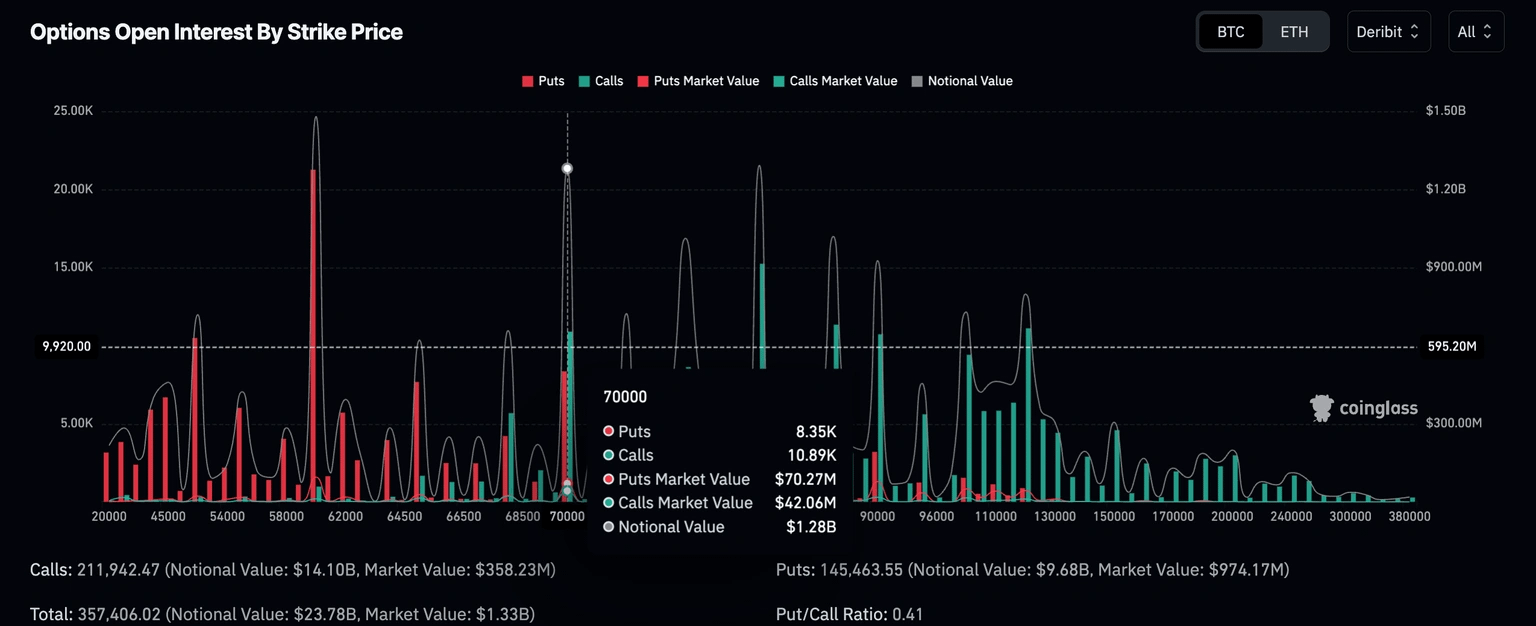 不过,70,000 美元价位的看涨期权头寸价值为 4,432 万美元,低于同一执行价位上价值 6,977 万美元的看跌期权头寸,显示出上方边界整体仍偏空。
