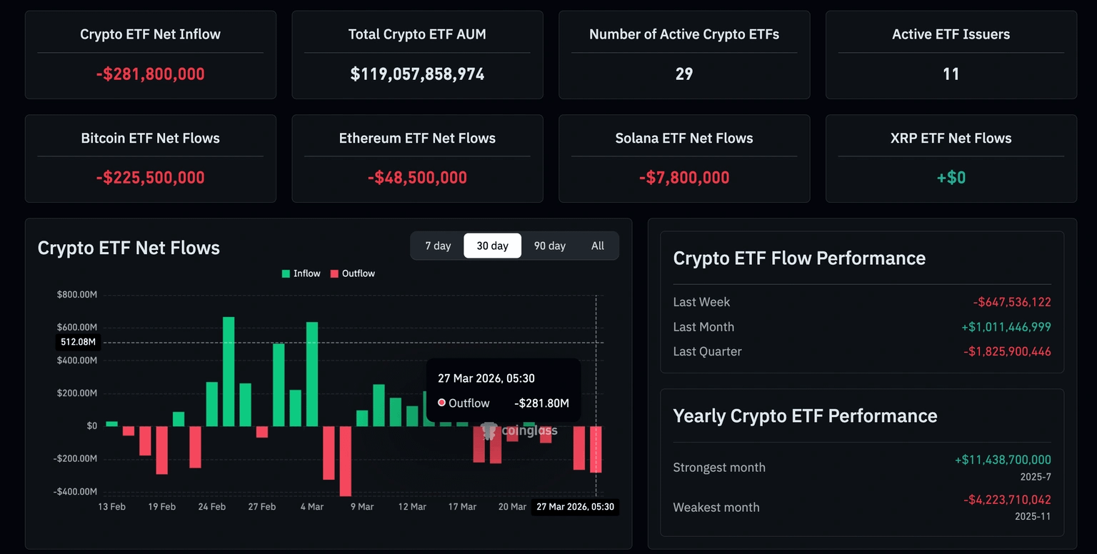 此外,CoinGlass 数据显示,机构对加密资产的需求仍然疲弱,而衍生品市场则在比特币关键价位附近出现头寸堆积。上周五,加密 ETF 净流出 2.818 亿美元,其中比特币 ETF 流出 2.255 亿美元,令全周所有加密 ETF 的总流出规模达到 6.47 亿美元。
