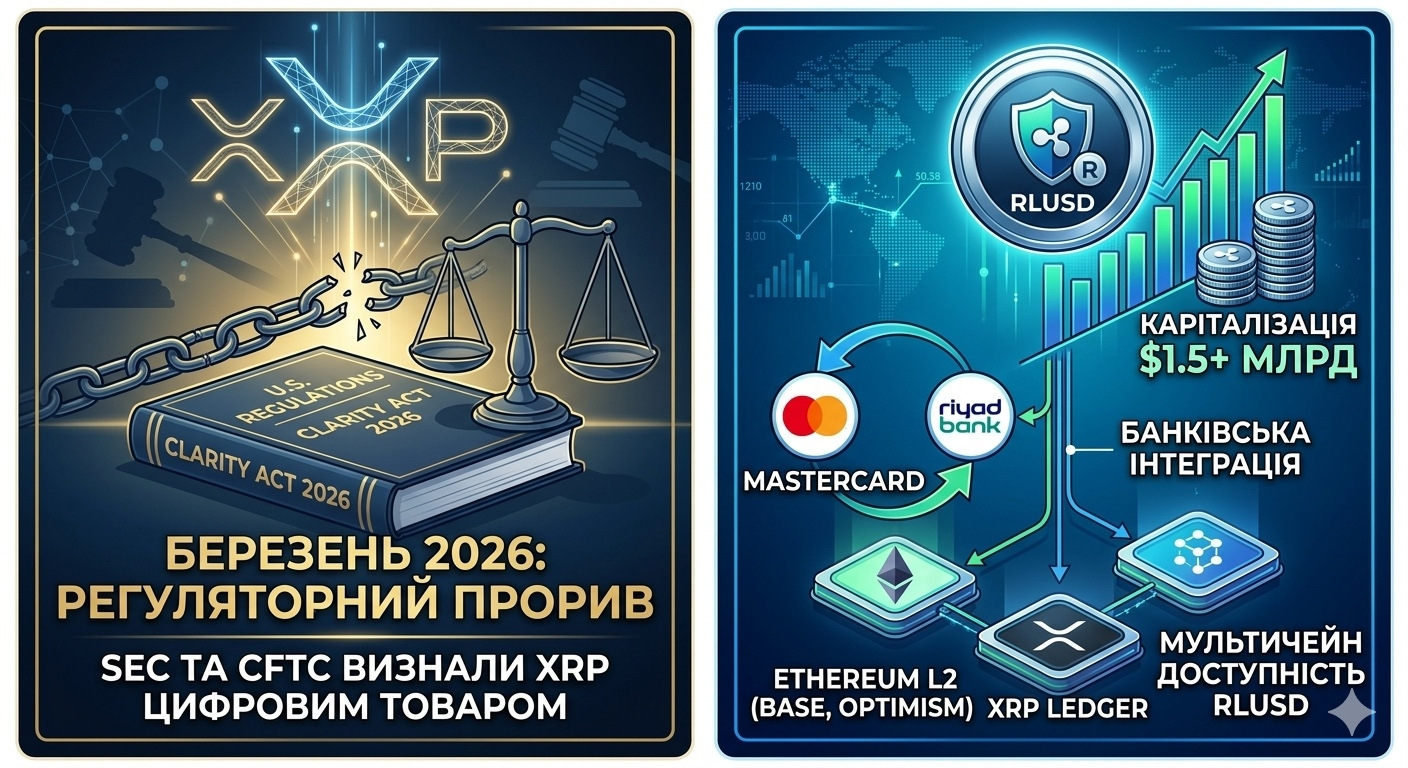 Головна новина березня — офіційне спільне роз'яснення SEC та CFTC, яке класифікувало XRP як цифровий товар. Це рішення фактично поставило крапку в суперечках щодо статусу токена, прирівнявши його до Bitcoin та Ether. Для інституційних інвесторів це стало «зеленим світлом», оскільки зняло ризики, пов'язані з порушенням законодавства про цінні папери.