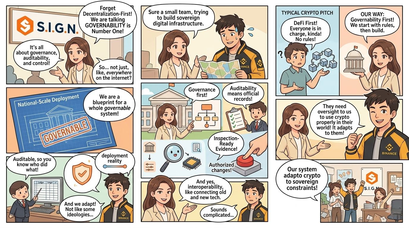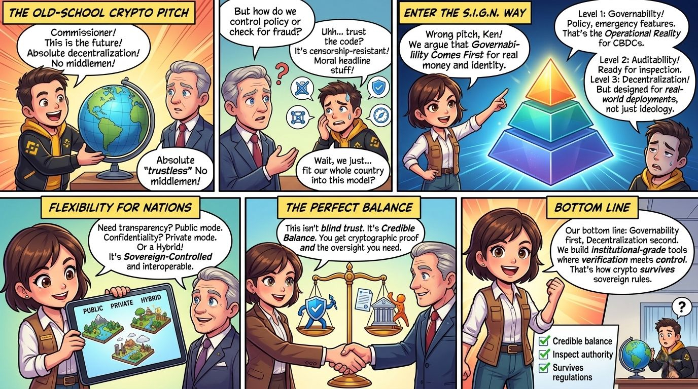 Se vieni a Sign aspettandoti una storia di pura decentralizzazione, quel linguaggio di governance può sembrare un compromesso. Ma non penso che stiano proponendo una purezza ideologica. Stanno proponendo qualcosa di più pragmatico: uno stack aperto e verificabile dove le prove rimangono portabili e crittografiche, mentre la governance e le operazioni rimangono compatibili con i requisiti regolamentati o sovrani.