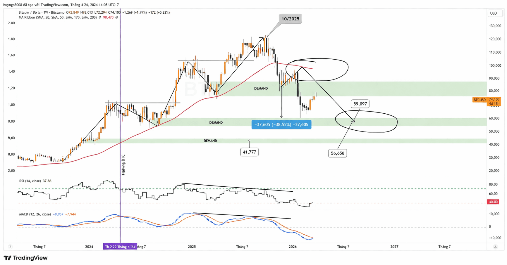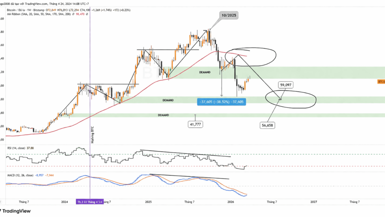 Guardando al grafico settimanale, i segnali di indebolimento erano già apparsi prima che il prezzo cadesse drasticamente. RSI e MACD hanno creato una divergenza ribassista, mentre il prezzo ha perso la MA50W. Ciò indica che la forza di rialzo precedente si stava indebolendo dall'interno. Una grande tendenza che inizia a indebolirsi di solito non si inverte immediatamente, ma passa attraverso una fase di ribasso prolungata, alternando rimbalzi abbastanza belli da creare speranza.