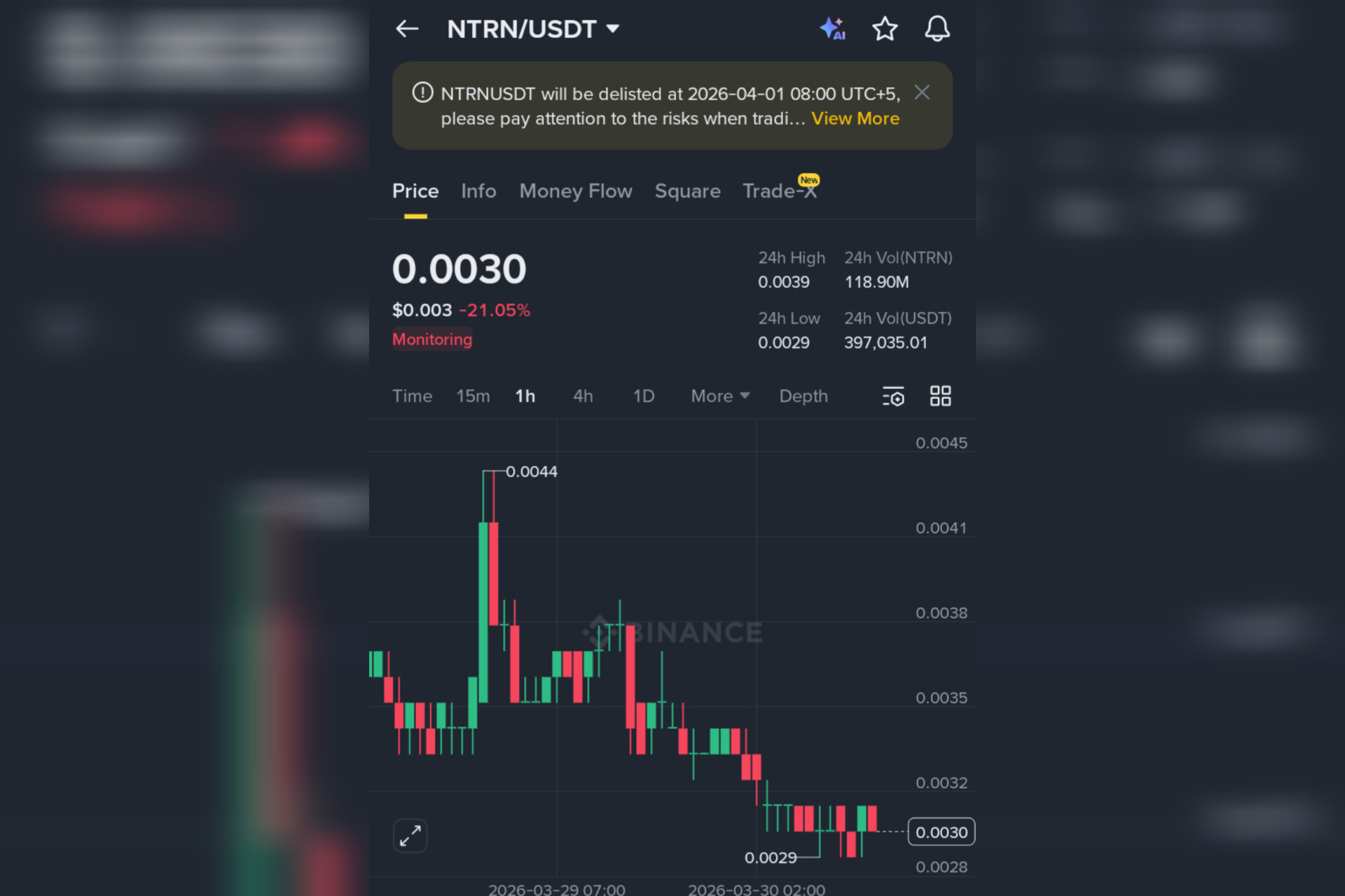 Ecco cosa è successo. Binance ha ufficialmente rimosso NTRNUSDT il 1 aprile 2026 alle 03:00 UTC. Il token era già stato contrassegnato con l'etichetta “Monitoraggio”, segnalando un rischio elevato. Con solo pochi giorni rimasti, i detentori rimasti stanno cercando di uscire, creando un vuoto di liquidità. I fondamenti del progetto—una piattaforma di smart contract CosmWasm—sono irrilevanti quando l'accesso all'exchange svanisce.