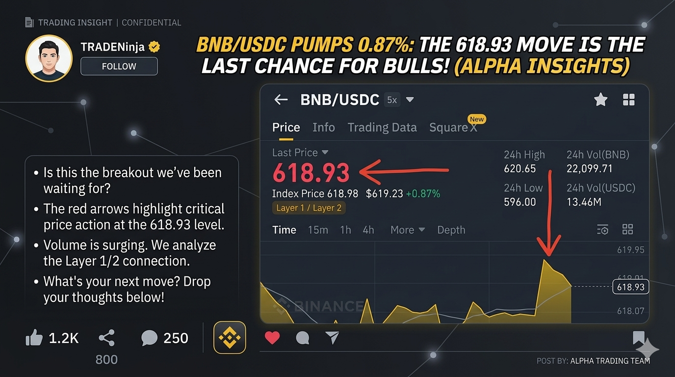 Our analysis on the $BNB / $USDC 5x chart indicates that this +0.87% pump—hitting 618.93—is the "Alpha Move" we've been tracking. But is this the confirmed breakout we’ve been waiting for, or a final gasp before a correction?