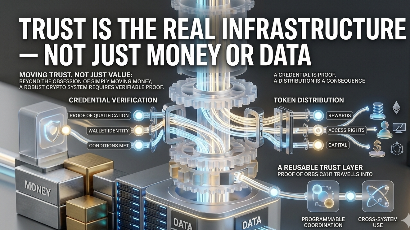 I keep coming back to the same thought when I look at crypto infrastructure: we’ve spent years obsessing over moving value, but not nearly enough time figuring out how to move trust. That sounds abstract at first, I know. But once you strip away the noise, a lot of systems don’t actually fail because money can’t move. They fail because nobody can confidently verify who qualifies, what’s true, what rule applies, or whether a claim should still be trusted.