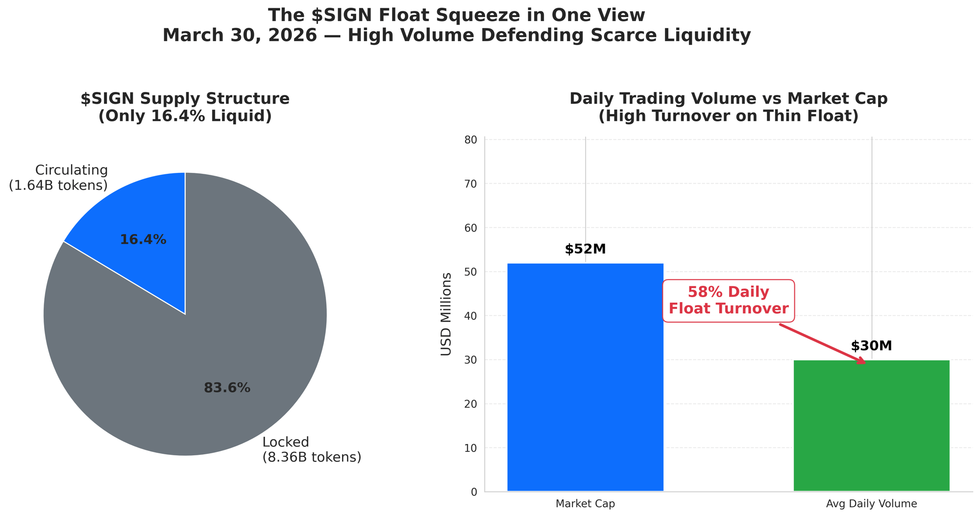Quello che mi colpisce di più non è l'azione del prezzo principale. È il volume puro rispetto al flottante. Stiamo vedendo $27-34 milioni scambiati la maggior parte dei giorni rispetto a quella capitalizzazione di mercato di $52 milioni. Questo è l'intero approvvigionamento liquido che gira più della metà del suo valore quotidianamente, anche attraverso la vendita. Nella mia esperienza nel seguire i token, quel tipo di fatturato sostenuto non avviene per caso. Suggerisce che i veri acquirenti stanno entrando velocemente mentre i venditori escono, probabilmente persone legate al livello di attestazione o agli strumenti di distribuzione che trattano il token come carburante operativo piuttosto che una rapida vendita. Il mercato sta prezzando la paura intorno ai futuri sblocchi, ma i libri degli ordini stanno raccontando una storia di difesa ostinata.