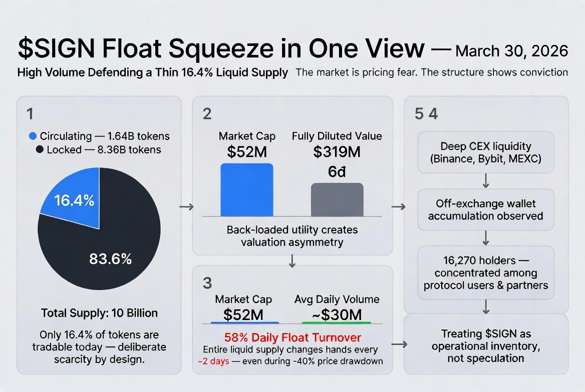 Ho seguito $SIGN piuttosto da vicino queste ultime settimane, il tipo di monitoraggio silenzioso che fai quando qualcosa sembra strano in un buon modo. Il prezzo ha subito un duro colpo, scendendo di oltre il 40% solo negli ultimi sette giorni, attestandosi attorno a $0.032 con una capitalizzazione di mercato che si aggira intorno ai 52 milioni di dollari. Sulla carta sembra un classico esaurimento post-hype. Ma quando togli i candele rosse e guardi effettivamente a come si muove il token, inizia a formarsi un'immagine diversa. Una che sembra più un accumulo lento e deliberato dell'unica offerta liquida esistente, da parte di persone che hanno davvero bisogno che il protocollo funzioni.