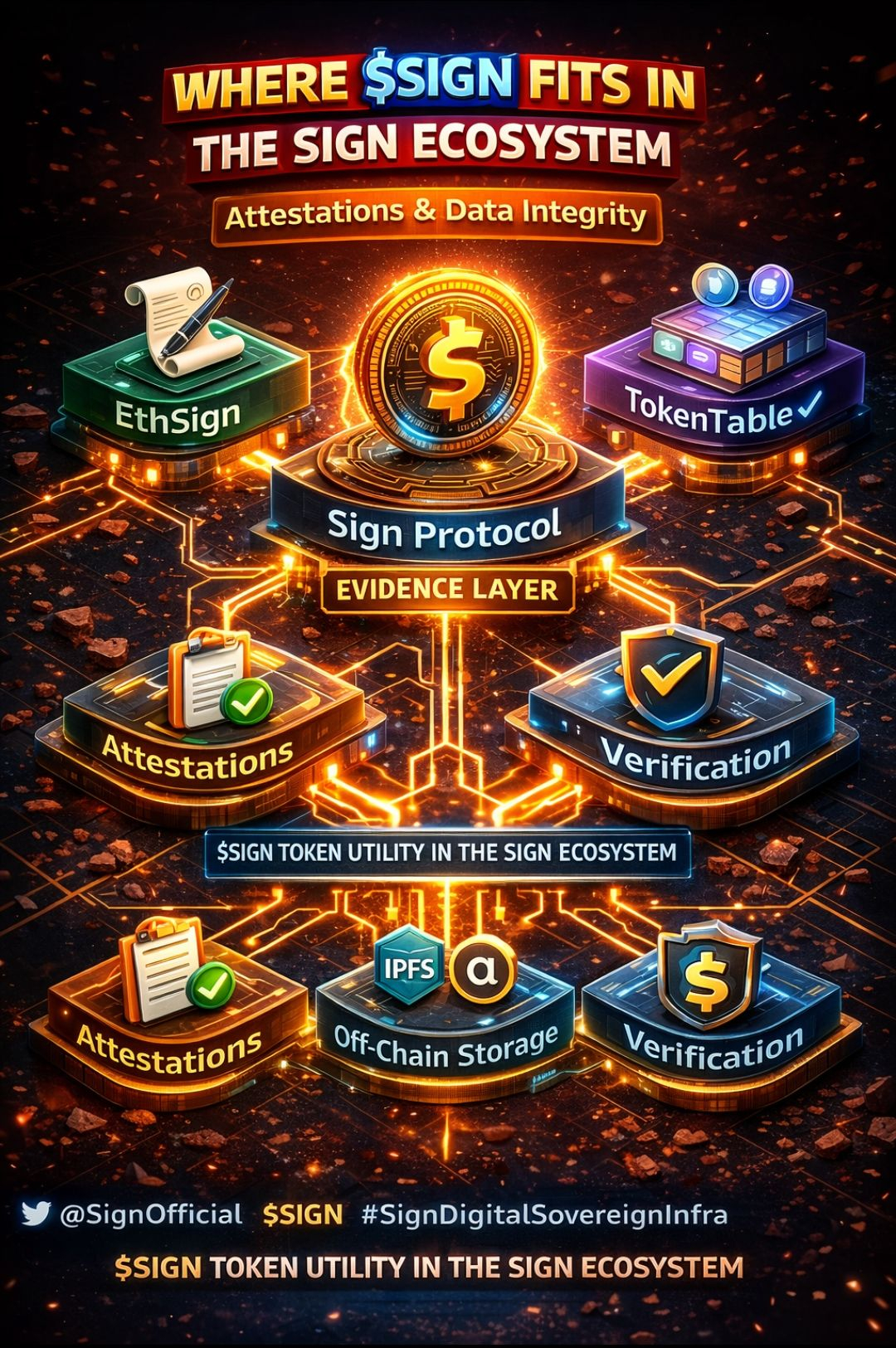 As you examine how $SIGN fits into the Sign ecosystem, you will find a clearly defined role for the token. The main way the token is used is in the evidence component of the ecosystem. This includes providing attestations, verifying attestations, and working with off-chain storage services like IPFS or Arweave. These are the most tangible and easily recognized uses of the token.