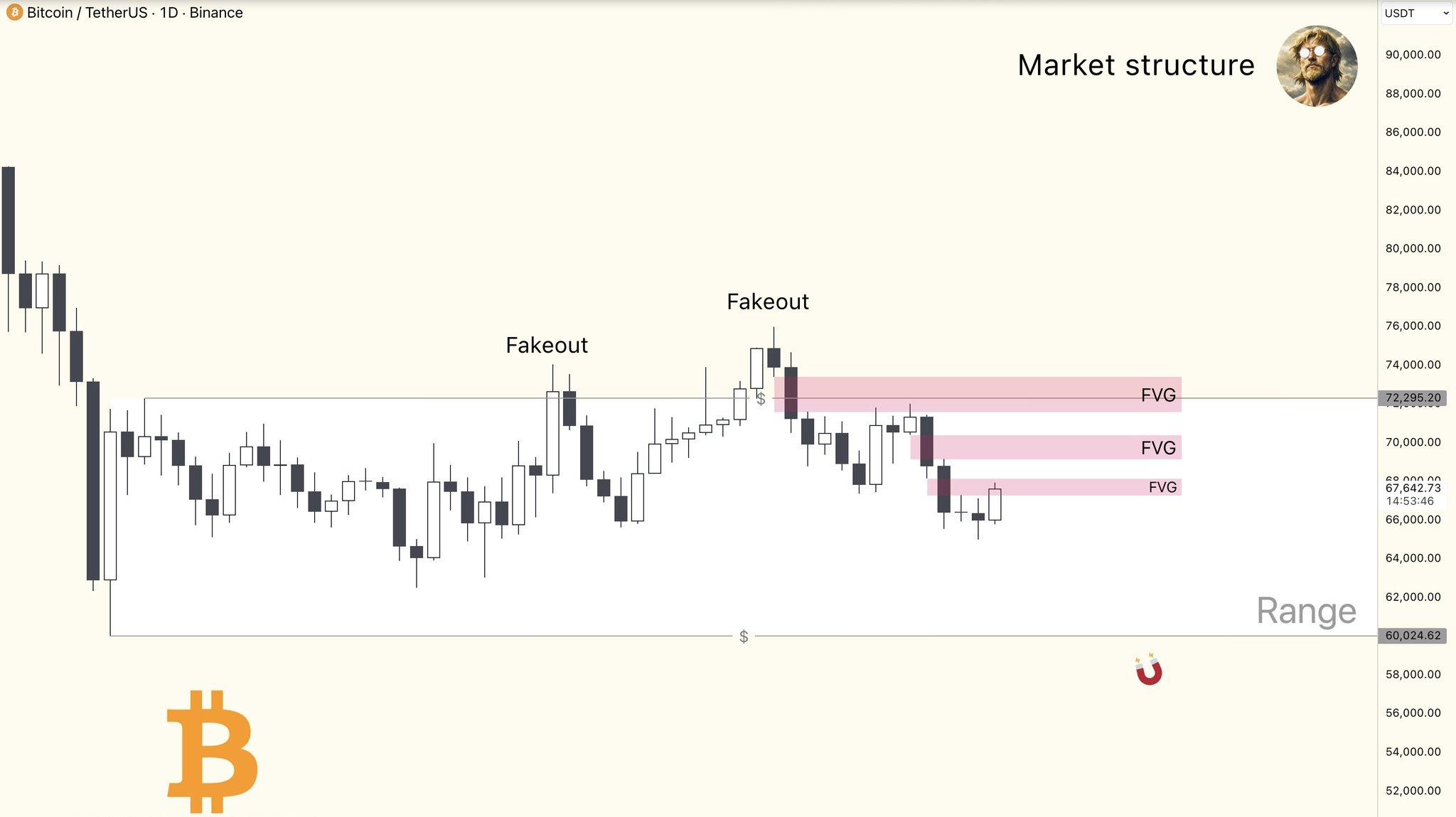 ¡Qué lo qué, mi gente! Il Bitcoin è ora in un campo di battaglia dove i tori e gli orsi si stanno dando di santa ragione, e il grafico non mente: siamo appesi a un filo a $65,800. 📉 Se guardi l'immagine che abbiamo in tavola, il prezzo sta facendo "fakeouts" (quei tentativi di rottura che finiscono in niente) vicino ai $74,000, lasciando più di uno intrappolato sopra. Ora, il prezzo sta cercando attrazione nella liquidità sottostante, e quegli spazi rosa che vedi contrassegnati come FVG (Fair Value Gaps) sono vuoti che il mercato prima o poi vorrà riempire per equilibrare i conti. 🧲