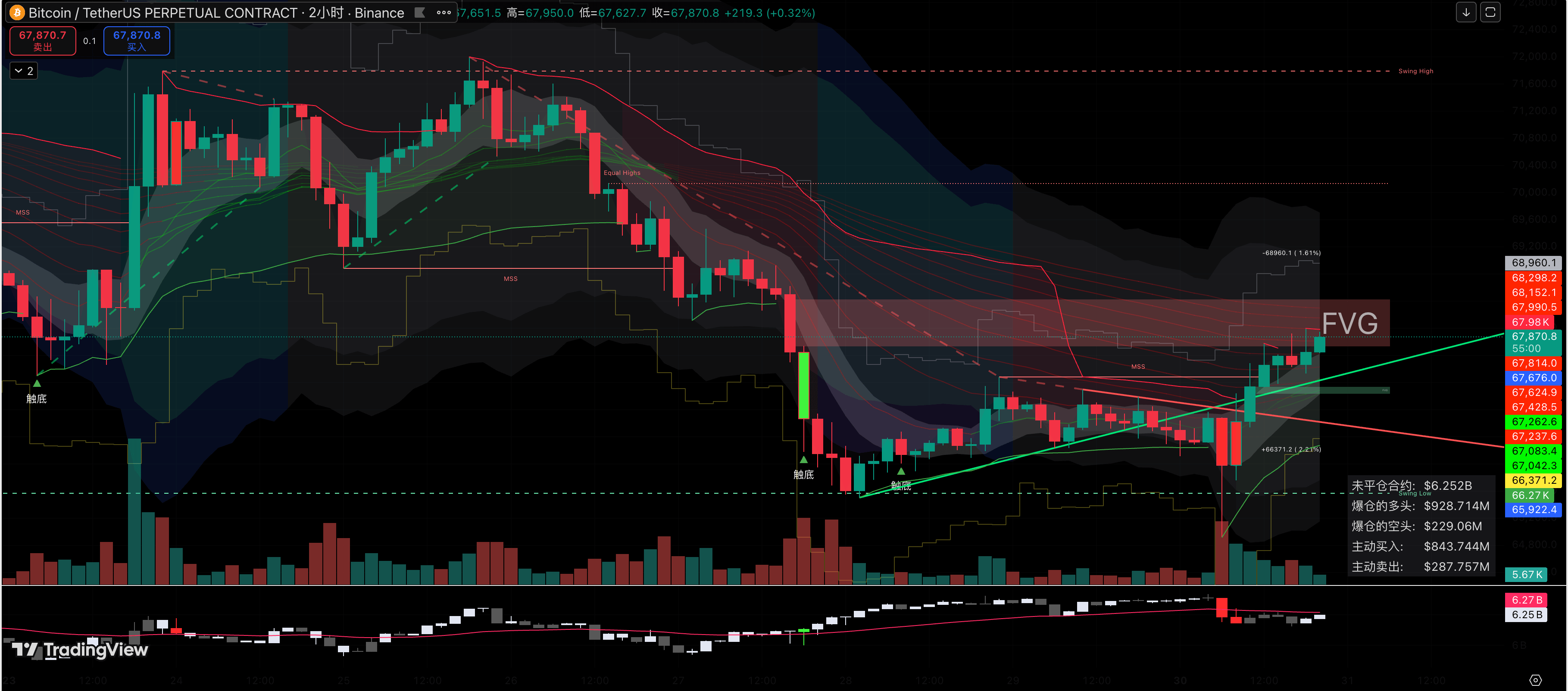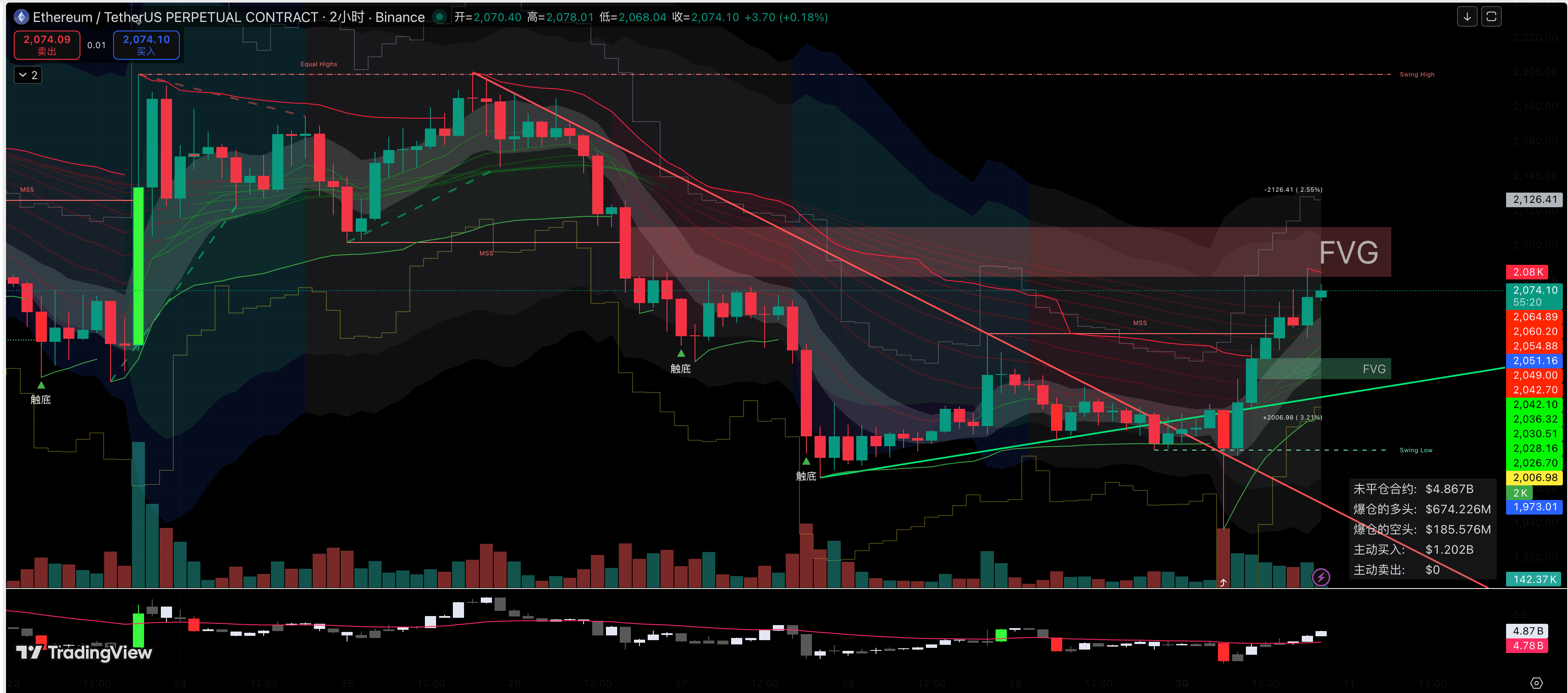 大饼的 FVG 死死压在 67800-68500 这一带,以太的 FVG 同样沉重地压在 2080-2120 附近。FVG 是什么?那是前期主力资金剧烈砸盘时留下的断层,里面堆积着海量的历史套牢盘。主力花了那么大的代价砸下去,现在拉上来是为了做慈善给你们解套的吗?绝对不可能!
