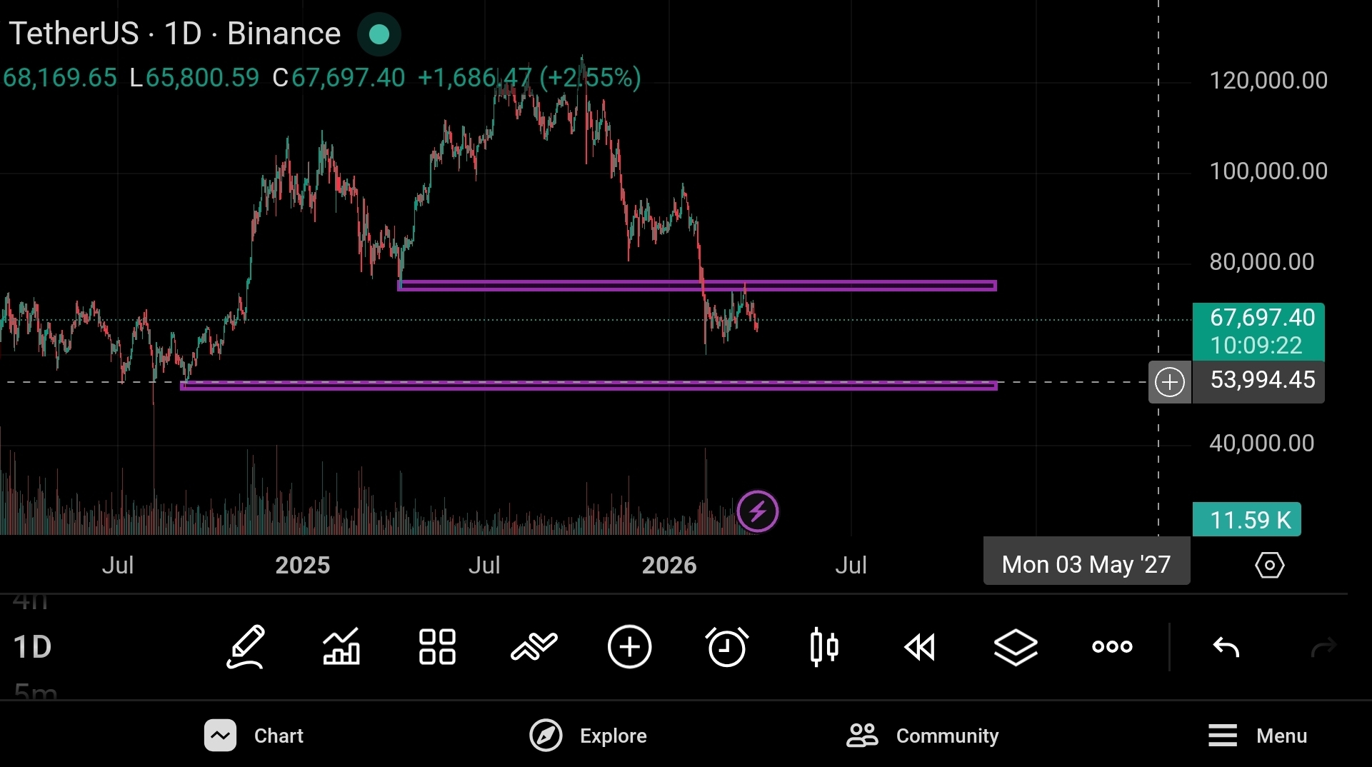 Current State: BTC is trading around $67,697. After a massive peak (the "double top" appearance in late 2025), the market has entered a corrective phase.