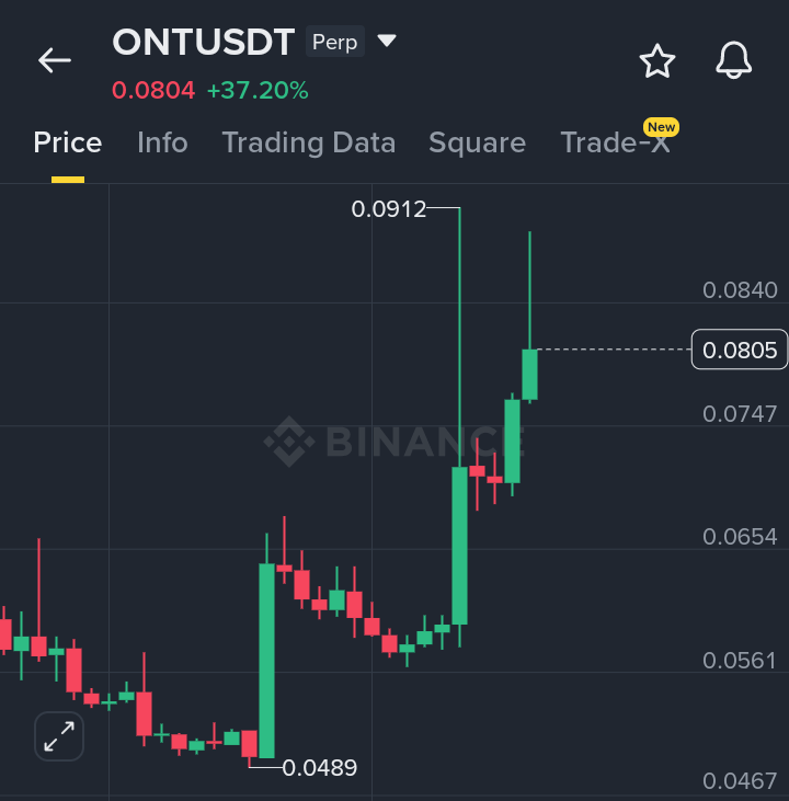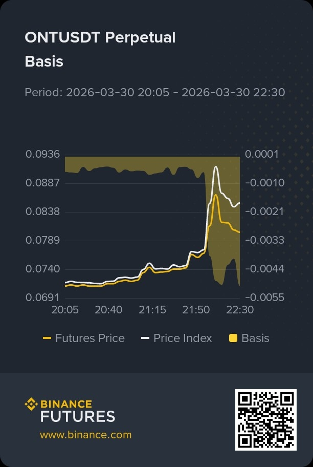 ONT is also moving strongly up about 37 percent. The candles and volume tell a similar story. This one is seeing big activity relative to its market cap and the liquidity is enough to support these big moves. The futures basis is slightly narrowing which can mean some profit taking is happening, but overall the trend is very bullish.