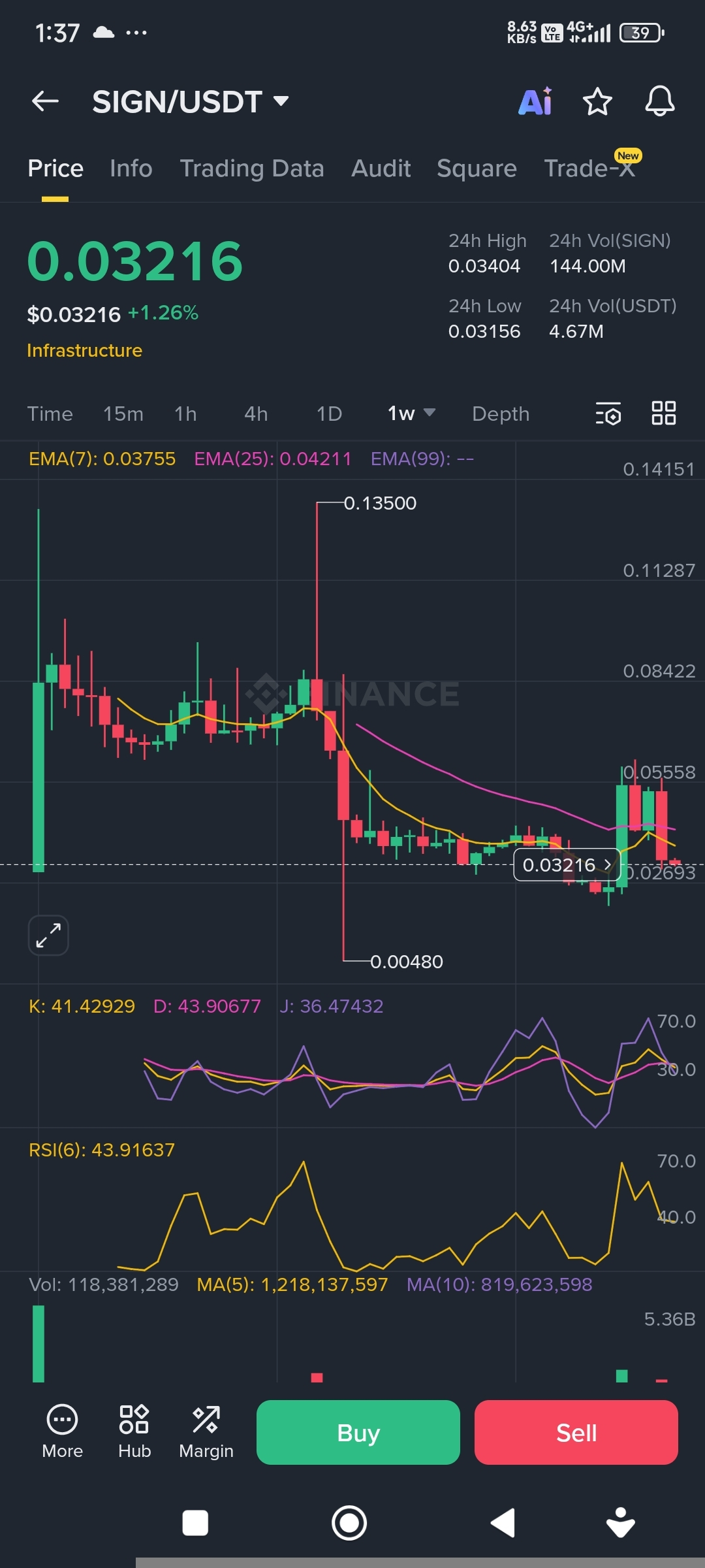 SIGN ရဲ့ chart ကို ကြည့်လိုက်ရင် သူကလဲ btc ကို follow လုပ်တယ်လို့ ပြောလို့ရတဲ့ အထဲမှာပါတယ် ။ နောက်တစ်ခုက လက်ရှိဈေးနှုန်းဟာ ( Lowest price / Floor price ) လို့ ပြောရမလိုတာင်ဖြစ်နတယ်ဆိုတာ့ ၀ယ်လို့ ကောင်းတဲ့ အချိန်လို့ ပြောလို့ရတယ် ။ တစ်ဖက်မှာလဲ သူ့ရဲ့ supply တွေက အရမ်းများတယ် ၊ ဈေးကွက်ထဲမှာ လည်ပါတ်နတဲ့ Supply ဟာ Max supply နဲ့ယှဉ်ကြည့်ရင် 16% / 17% နှုန်းလောက်ပဲ ရှိတယ် ။ 83% လောက်က ထပ်ထွက်လာဖို့ရှိနေသးတယ်ဆိုတော့ ရေရှည်အတွက်ဆိုရင် အချိန်များများယူပြီး စဉ်းစားတွက်ချက်ဖို့တာ့ လိုလိမ့်မယ် ။