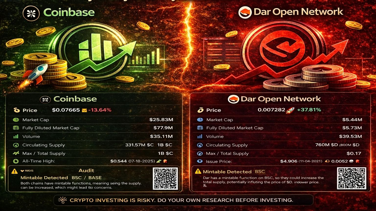 I’ve been watching these two closely and honestly the market is giving me a mix of excitement and caution Coinbase has been down about 13 percent and it feels like it is testing patience The audit shows it has a mintable function which means the total supply can increase and that alone can put pressure on price if new tokens are released That’s why I’m watching the charts and volume very closely before thinking about any entries